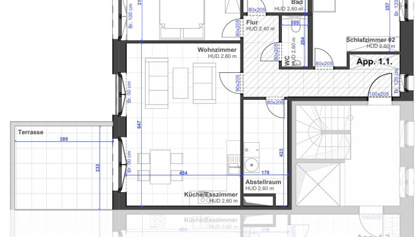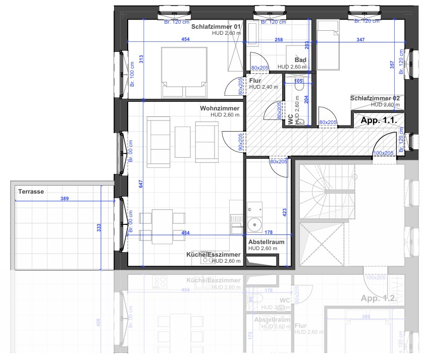 Das Appartement 1.1 verfügt über eine Größe von 96m². Es handelt sich hierbei um die letzte verfügbare Wohnung auf der 1. Etage, sowie die letzte Wohnung mit einem Balkon.