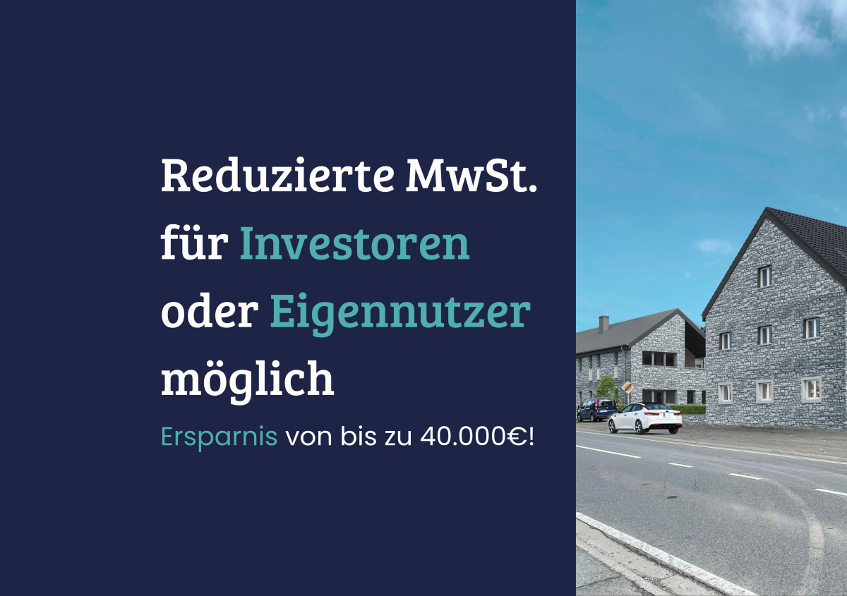 Jetzt investieren und 6 % statt 21 % Mehrwertsteuer auf Neubau zahlen. Dieser einzigartige Steuervorteil macht das Investieren in Ostbelgien so attraktiv wie nie zuvor – ob zur Eigennutzung oder als zukunftssichere Kapitalanlage.