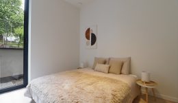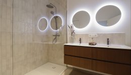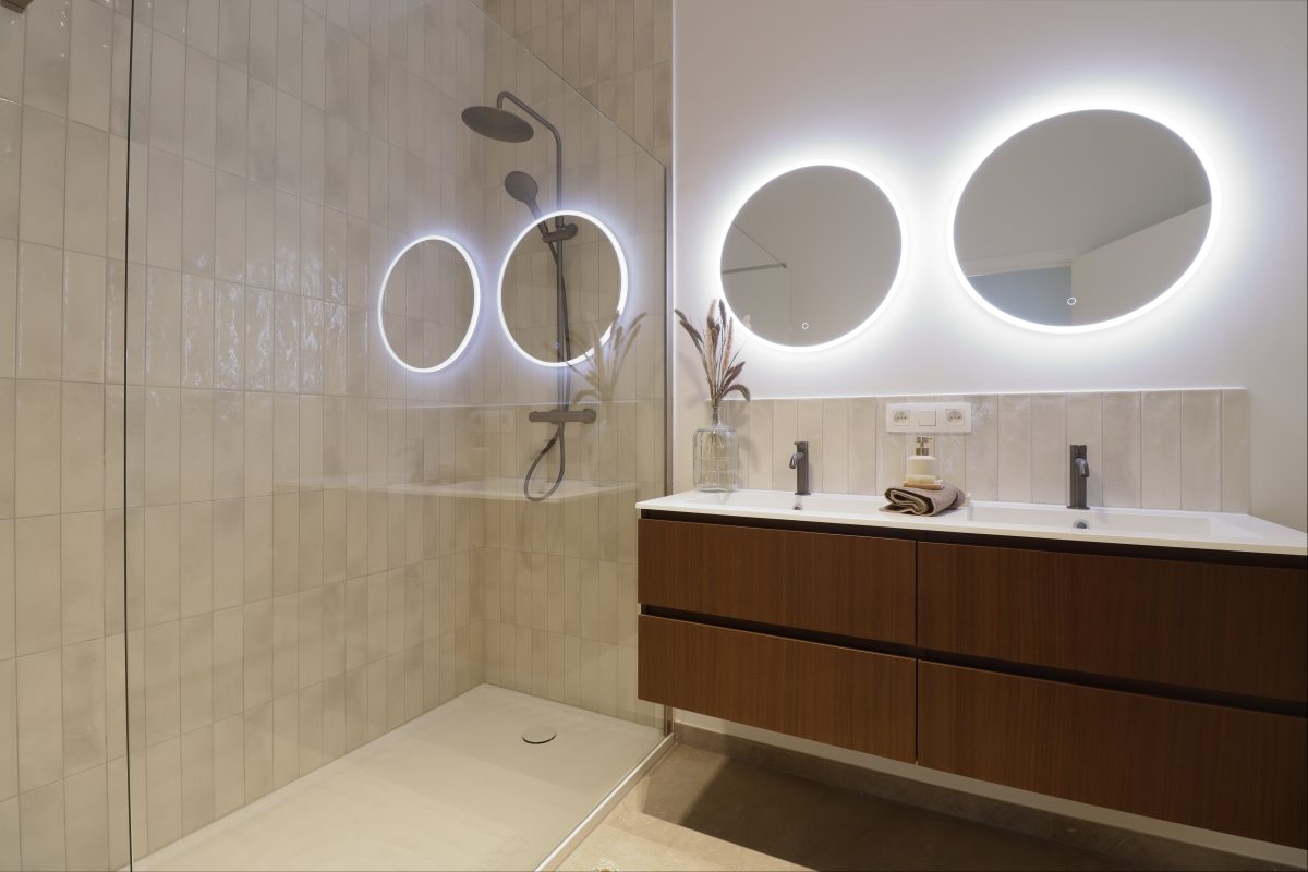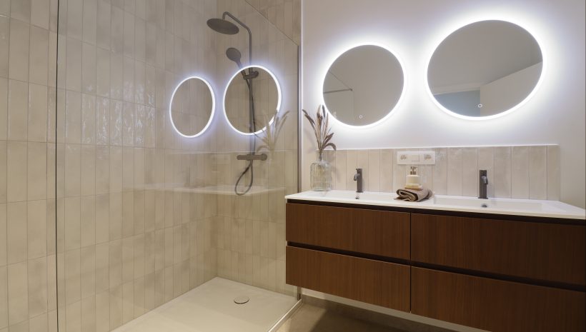 Die Wohnung umfasst außerdem zwei helle Schlafzimmer, einen Abstellraum, ein separates WC und ein Badezimmer, das mit einem Doppelwaschbecken und einer begehbaren Dusche ausgestattet ist.