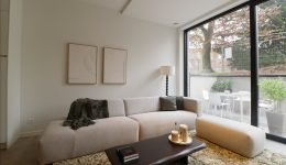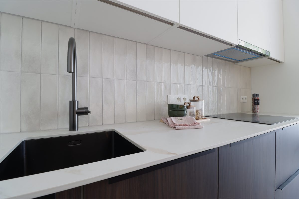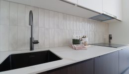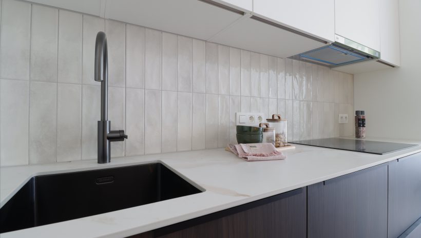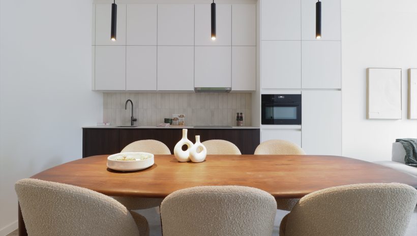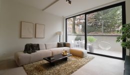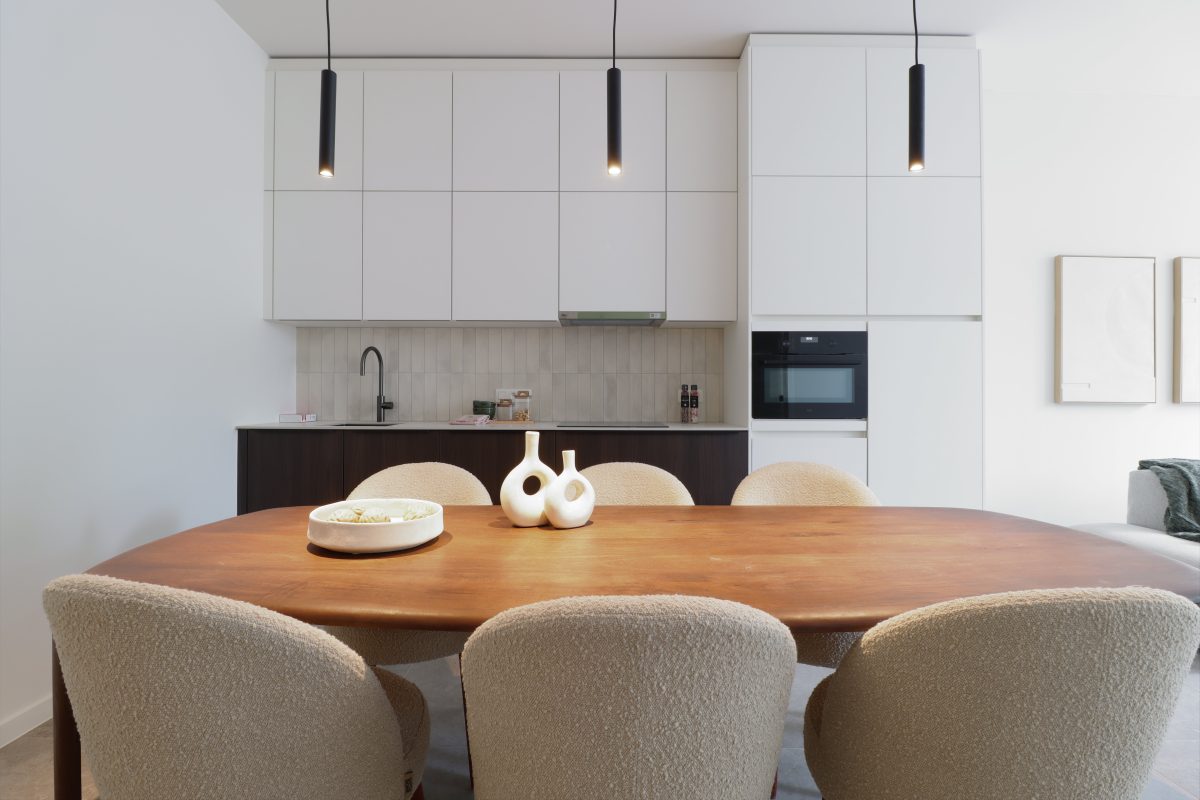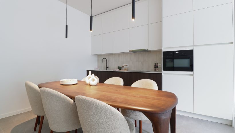 Der Eingangsbereich mit Platz für eine kleine Sitzmöglichkeit und eine Garderobe führt in das großzügige, lichtdurchflutete Wohnzimmer. Eine stilvolle Küche mit viel Stauraum ist bereits eingebaut worden. Die hohen Decken schaffen ein außergewöhnliches Wohnambiente, und die großen Schiebeelemente durchfluten den Raum mit Tageslicht. Eine Terrasse lädt zum Entspannen an schönen Tagen ein.