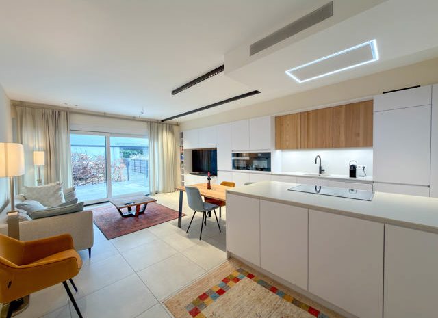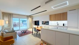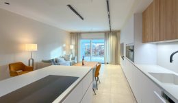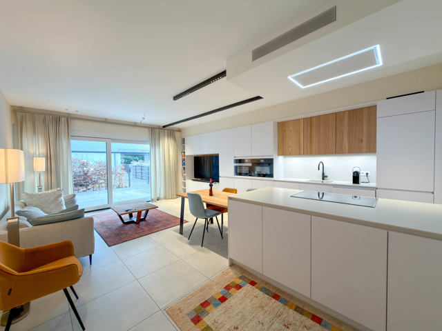 Die voll ausgestattete Küche ist mit einer Naturstein-Arbeitsplatte, hochwertigen Miele-Elektrogeräten sowie einem integrierten Weinkühlschrank ausgestattet. Für ein hohes Maß an Wohnkomfort sorgen Fußbodenheizung, eine gemeinschaftliche Wärmepumpe, leistungsstarke Verglasungen und eine kontrollierte Wohnraumlüftung mit Wärmerückgewinnung.