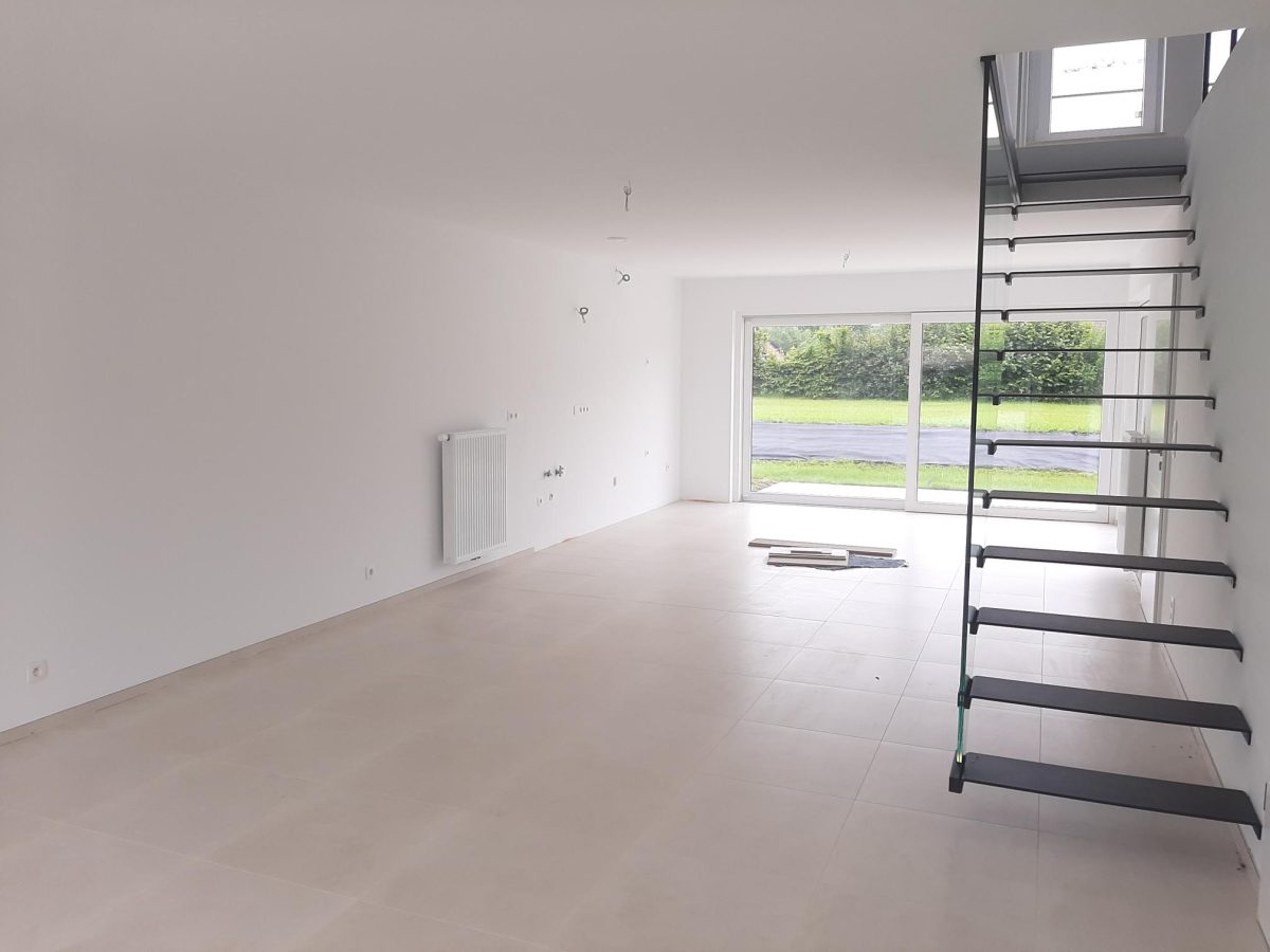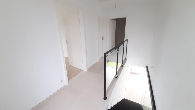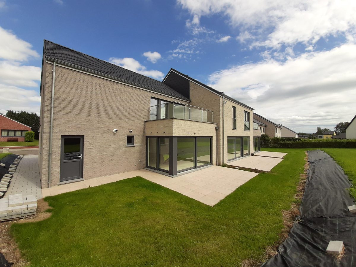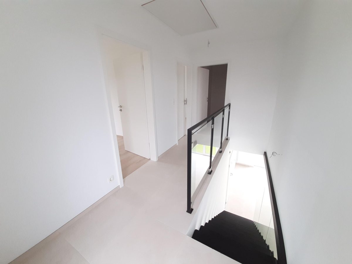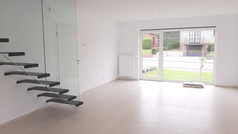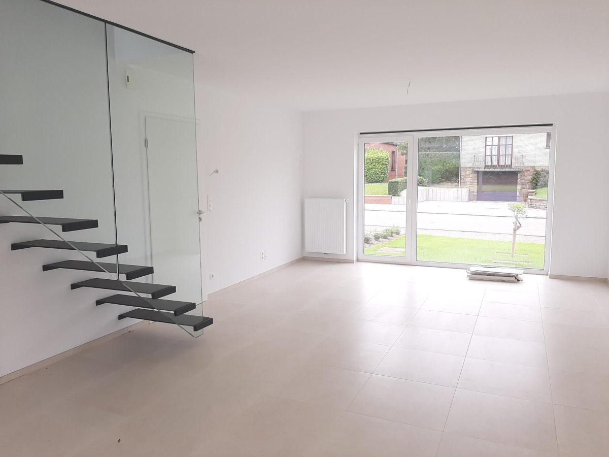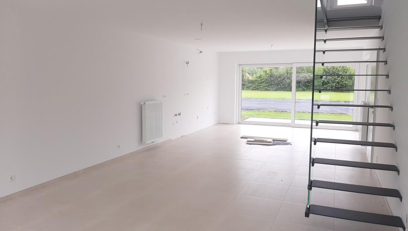 Wunderschönes neues Reihenhaus nach modernsten Standards gebaut. Es handelt sich um einen Neubau auf einem cirka 400 m² grossen Baugrundstück und ausgestattet mit allen modernen technischen Anforderungen, wie zum Beispiel mechanische Lüftung, Regenwasserzisterne von 10 000 Liter, Gaskondensatortherme, Isolation, usw. Alle Böden sind komplett gefliest, das Haus hat ebenfalls eine geflieste Terrasse sowie einen mit Bodenklinkern ausgelegten Weg zum Eingang und zur Garage. Alle Wände sind weiss gestrichen. Kommen wir nun zur Raumaufteilung, auf dem Erdgeschoss befindet die Eingangdiele mit Gäste-WC und dem Zugang zum wunderbar lichtdurchflutenten Wohn-, Esszimmer mit offener Küche, die einen sehr schönen Blick auf die Terrasse bietet durch die Tatsache, daß zwei Seiten, die die hintere Ecke des Hauses bilden, mit bodenebenen Fenstern ausgestattet sind und Sie so die Mittags- und Abendsonne geniessen können. Der Rest dieses sehr grossen Zimmers (etwa 50 m²) erstreckt sich über die gesamte Länge des Hauses, sodaß man von der Terrasse einen direkten Blick auf die Strasse haben kann, sofern man dies möchte. Eine wunderschöne Metalltreppe mit solider Glaswand, ein echter „Eyecatcher“ in diesem Raum, führt Sie auf die erste Etage mit Nachtflur, drei geräumigen Schlafzimmern, die wie schon erwähnt, mit Bodenfliesen, die einen Parkettbelag imitieren, ausgelegt sind. Ein weiteres Highlight ist das moderne Bad mit bodenebener italienischer Dusche, WC und Doppelwaschtisch. Selbstverständlich verfügt dieses Haus ebenfalls über einen nach Süden ausgerichteten Balkon. Ein grosser Speicher eignet sich hervorragend dazu, nicht oft benötigte Utensilien zu lagern. Das Haus verfügt natürlich über eine mit einem elektrischen Sektionaltor geschlossene Garage mit Zugang zum Garten und einen Hauswirtschaftsraum mit Waschmaschinenanschluss. Dieser Raum befindet sich zwischen Küche und Garage, sodaß dort ebenfalls alle nötigen Vorräte zwischengelagert werden können. Sehr schöne Lage am Stadtrand von Welkenraedt und fantastischer Weitblick.