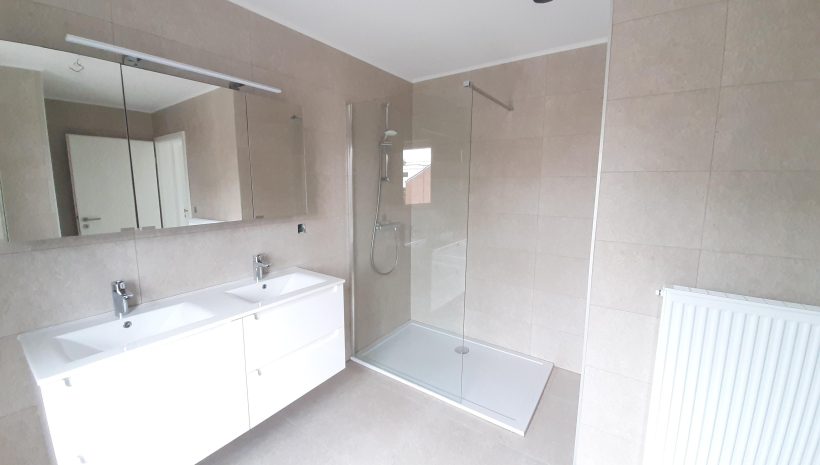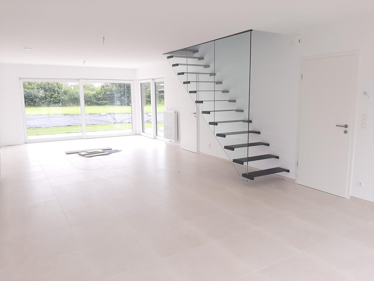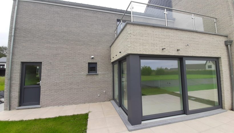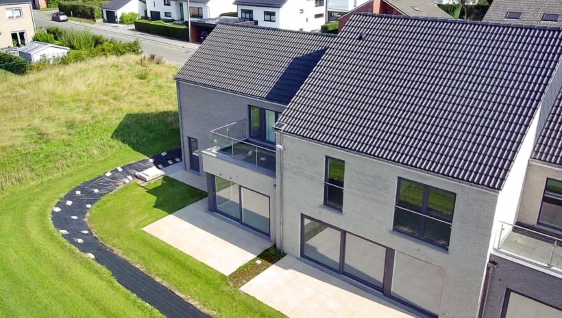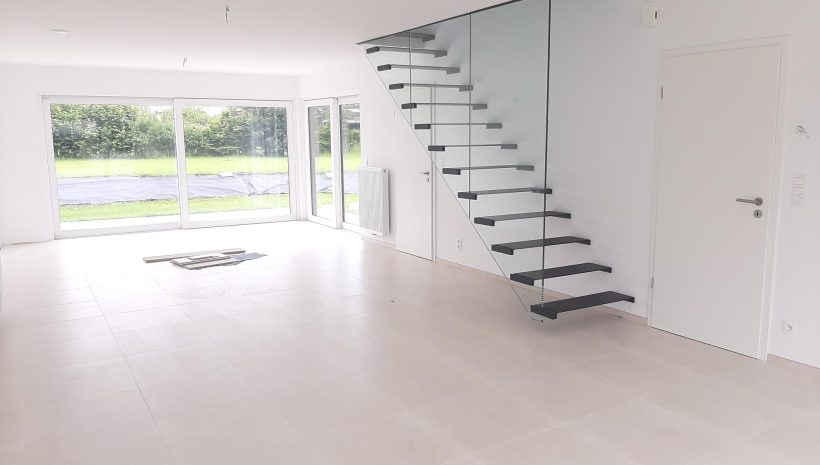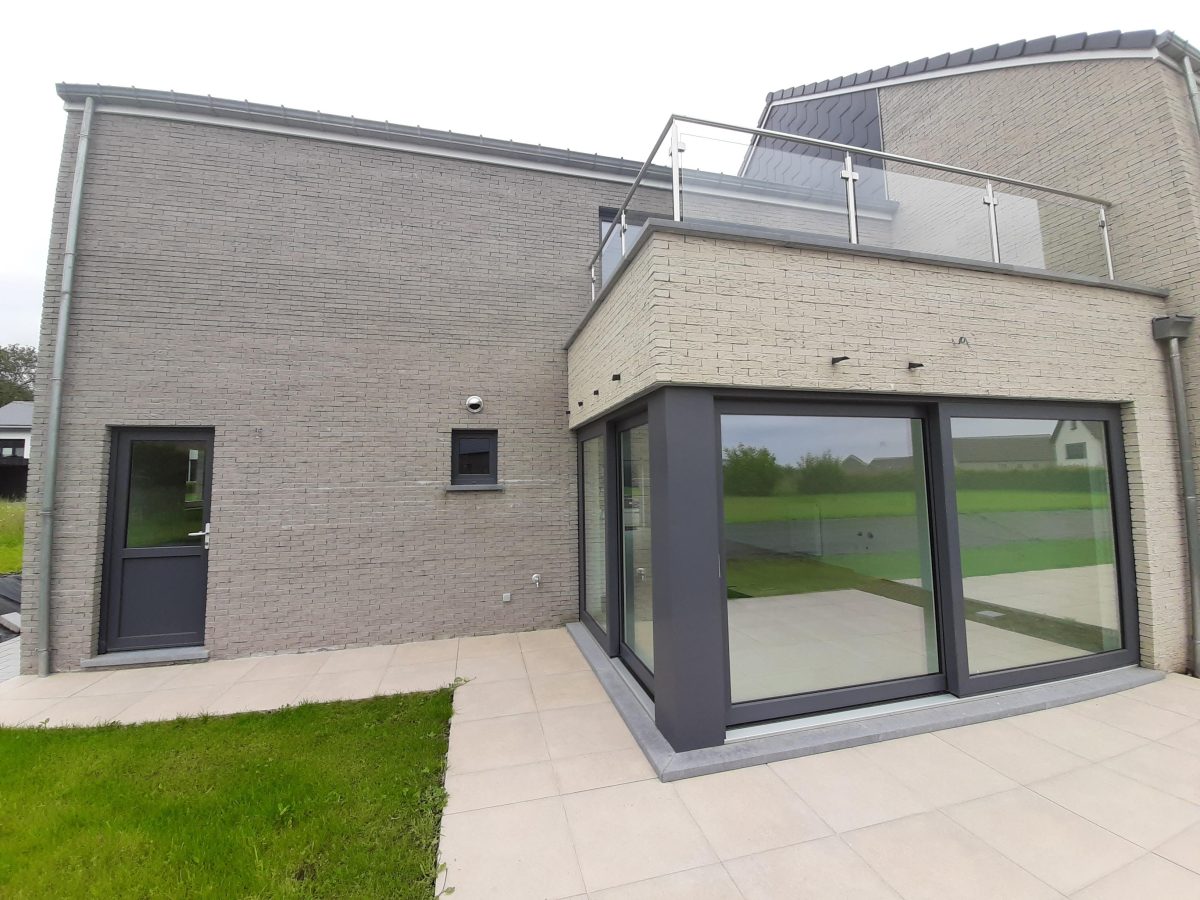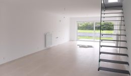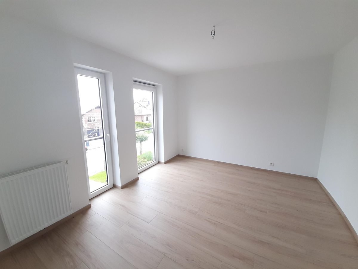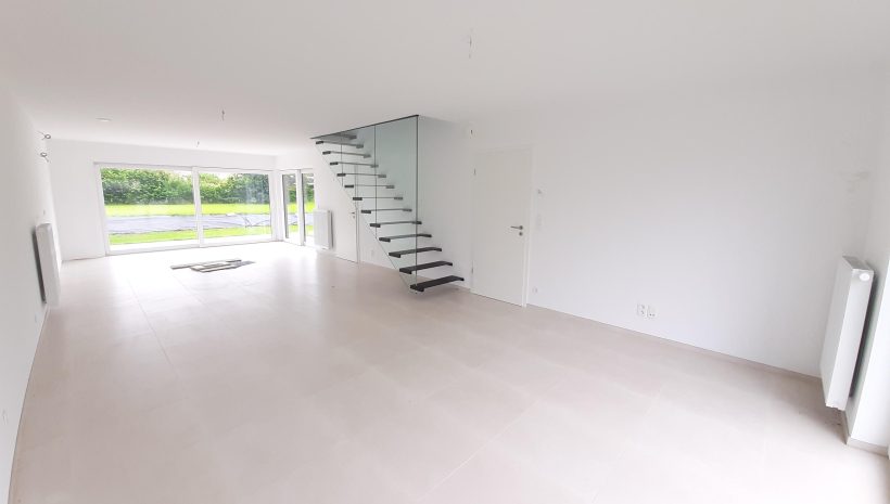 Wunderschönes neues Reihenhaus nach modernsten Standards gebaut. Es handelt sich um einen Neubau auf einem cirka 400 m² grossen Baugrundstück und ausgestattet mit allen modernen technischen Anforderungen, wie zum Beispiel mechanische Lüftung, Regenwasserzisterne von 10 000 Liter, Gaskondensatortherme, Isolation, usw. Alle Böden sind komplett gefliest, das Haus hat ebenfalls eine geflieste Terrasse sowie einen mit Bodenklinkern ausgelegten Weg zum Eingang und zur Garage. Alle Wände sind weiss gestrichen. Kommen wir nun zur Raumaufteilung, auf dem Erdgeschoss befindet die Eingangdiele mit Gäste-WC und dem Zugang zum wunderbar lichtdurchflutenten Wohn-, Esszimmer mit offener Küche, die einen sehr schönen Blick auf die Terrasse bietet durch die Tatsache, daß zwei Seiten, die die hintere Ecke des Hauses bilden, mit bodenebenen Fenstern ausgestattet sind und Sie so die Mittags- und Abendsonne geniessen können. Der Rest dieses sehr grossen Zimmers (etwa 50 m²) erstreckt sich über die gesamte Länge des Hauses, sodaß man von der Terrasse einen direkten Blick auf die Strasse haben kann, sofern man dies möchte. Eine wunderschöne Metalltreppe mit solider Glaswand, ein echter „Eyecatcher“ in diesem Raum, führt Sie auf die erste Etage mit Nachtflur, drei geräumigen Schlafzimmern, die wie schon erwähnt, mit Bodenfliesen, die einen Parkettbelag imitieren, ausgelegt sind. Ein weiteres Highlight ist das moderne Bad mit bodenebener italienischer Dusche, WC und Doppelwaschtisch. Selbstverständlich verfügt dieses Haus ebenfalls über einen nach Süden ausgerichteten Balkon. Ein grosser Speicher eignet sich hervorragend dazu, nicht oft benötigte Utensilien zu lagern. Das Haus verfügt natürlich über eine mit einem elektrischen Sektionaltor geschlossene Garage mit Zugang zum Garten und einen Hauswirtschaftsraum mit Waschmaschinenanschluss. Dieser Raum befindet sich zwischen Küche und Garage, sodaß dort ebenfalls alle nötigen Vorräte zwischengelagert werden können. Sehr schöne Lage am Stadtrand von Welkenraedt und fantastischer Weitblick.