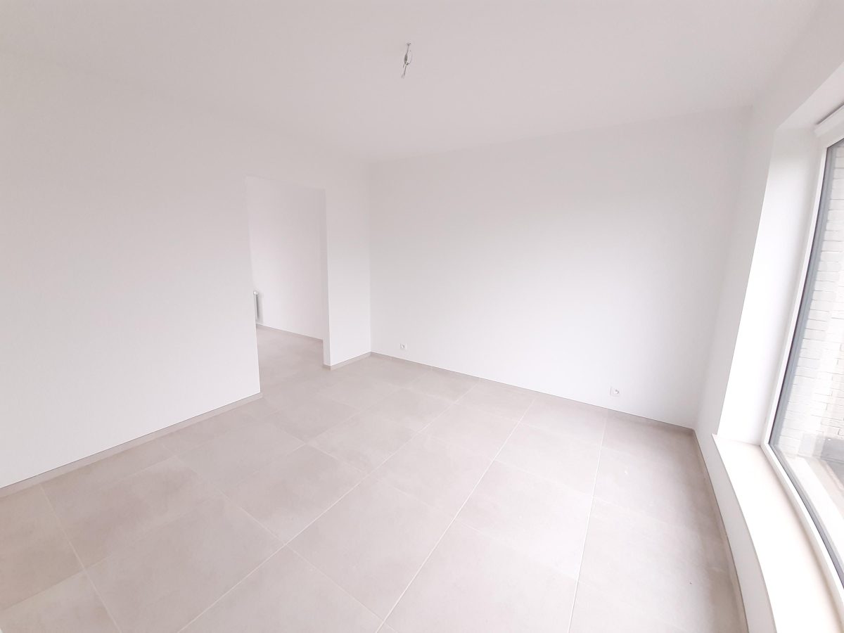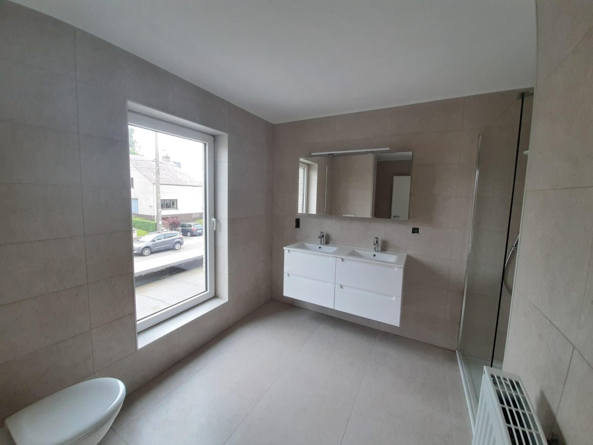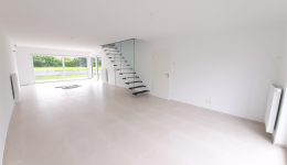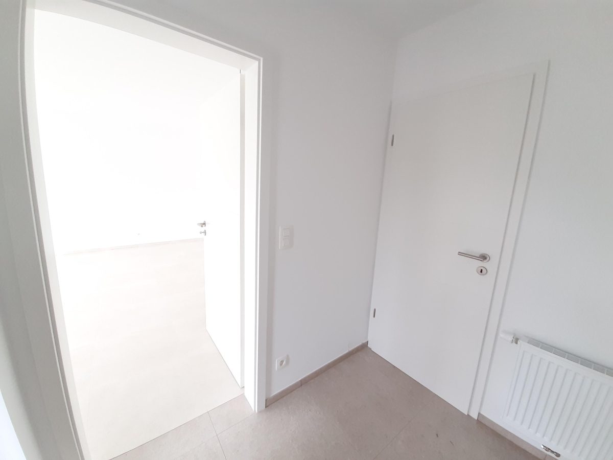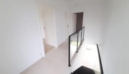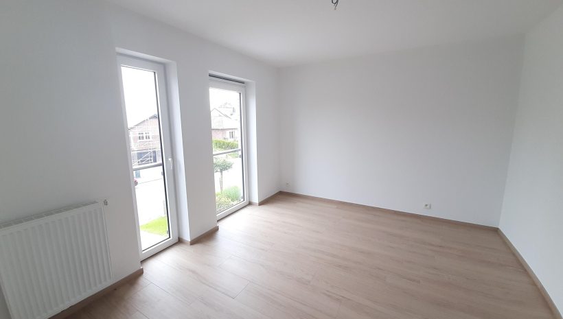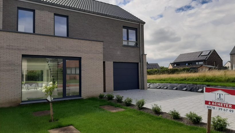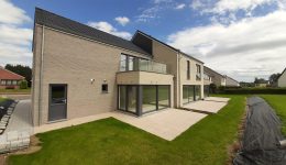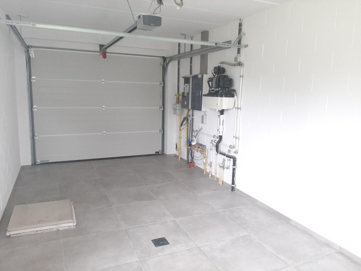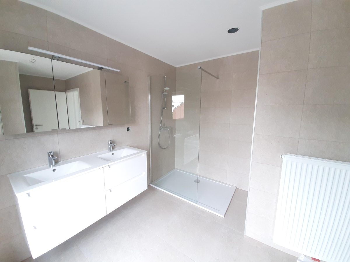 Wunderschönes neues Reihenhaus nach modernsten Standards gebaut. Es handelt sich um einen Neubau auf einem cirka 400 m² grossen Baugrundstück und ausgestattet mit allen modernen technischen Anforderungen, wie zum Beispiel mechanische Lüftung, Regenwasserzisterne von 10 000 Liter, Gaskondensatortherme, Isolation, usw. Alle Böden sind komplett gefliest, das Haus hat ebenfalls eine geflieste Terrasse sowie einen mit Bodenklinkern ausgelegten Weg zum Eingang und zur Garage. Alle Wände sind weiss gestrichen. Kommen wir nun zur Raumaufteilung, auf dem Erdgeschoss befindet die Eingangdiele mit Gäste-WC und dem Zugang zum wunderbar lichtdurchflutenten Wohn-, Esszimmer mit offener Küche, die einen sehr schönen Blick auf die Terrasse bietet durch die Tatsache, daß zwei Seiten, die die hintere Ecke des Hauses bilden, mit bodenebenen Fenstern ausgestattet sind und Sie so die Mittags- und Abendsonne geniessen können. Der Rest dieses sehr grossen Zimmers (etwa 50 m²) erstreckt sich über die gesamte Länge des Hauses, sodaß man von der Terrasse einen direkten Blick auf die Strasse haben kann, sofern man dies möchte. Eine wunderschöne Metalltreppe mit solider Glaswand, ein echter „Eyecatcher“ in diesem Raum, führt Sie auf die erste Etage mit Nachtflur, drei geräumigen Schlafzimmern, die wie schon erwähnt, mit Bodenfliesen, die einen Parkettbelag imitieren, ausgelegt sind. Ein weiteres Highlight ist das moderne Bad mit bodenebener italienischer Dusche, WC und Doppelwaschtisch. Selbstverständlich verfügt dieses Haus ebenfalls über einen nach Süden ausgerichteten Balkon. Ein grosser Speicher eignet sich hervorragend dazu, nicht oft benötigte Utensilien zu lagern. Das Haus verfügt natürlich über eine mit einem elektrischen Sektionaltor geschlossene Garage mit Zugang zum Garten und einen Hauswirtschaftsraum mit Waschmaschinenanschluss. Dieser Raum befindet sich zwischen Küche und Garage, sodaß dort ebenfalls alle nötigen Vorräte zwischengelagert werden können. Sehr schöne Lage am Stadtrand von Welkenraedt und fantastischer Weitblick.