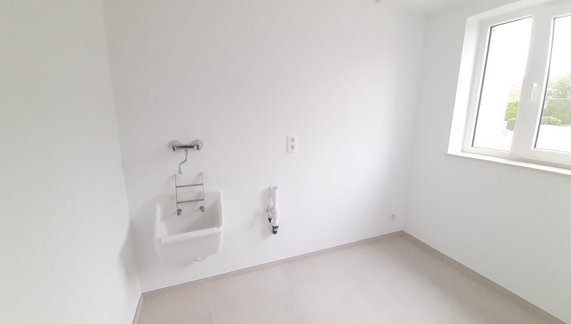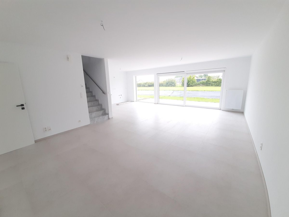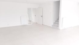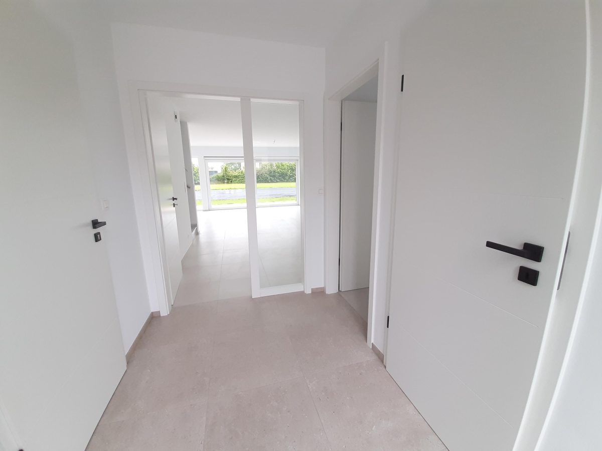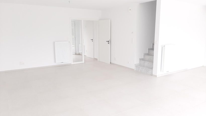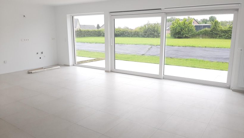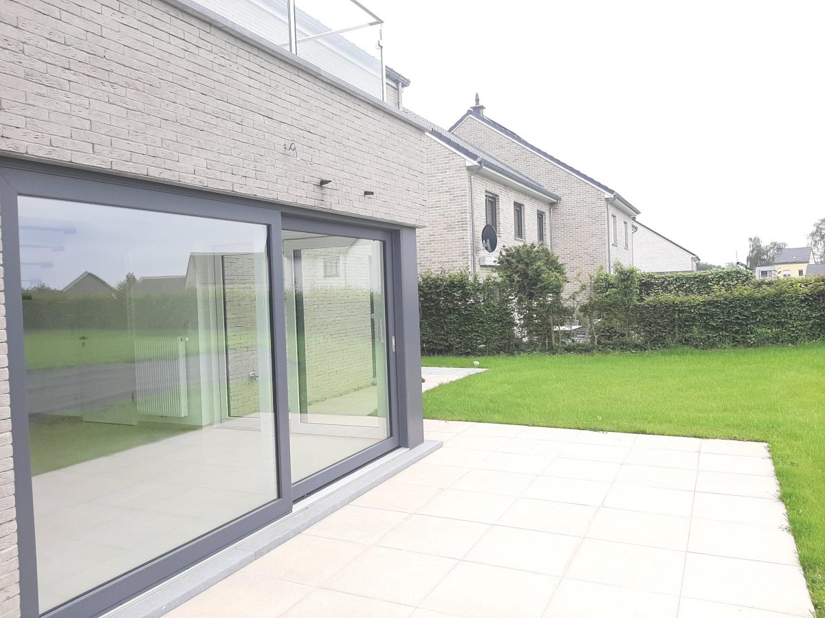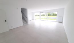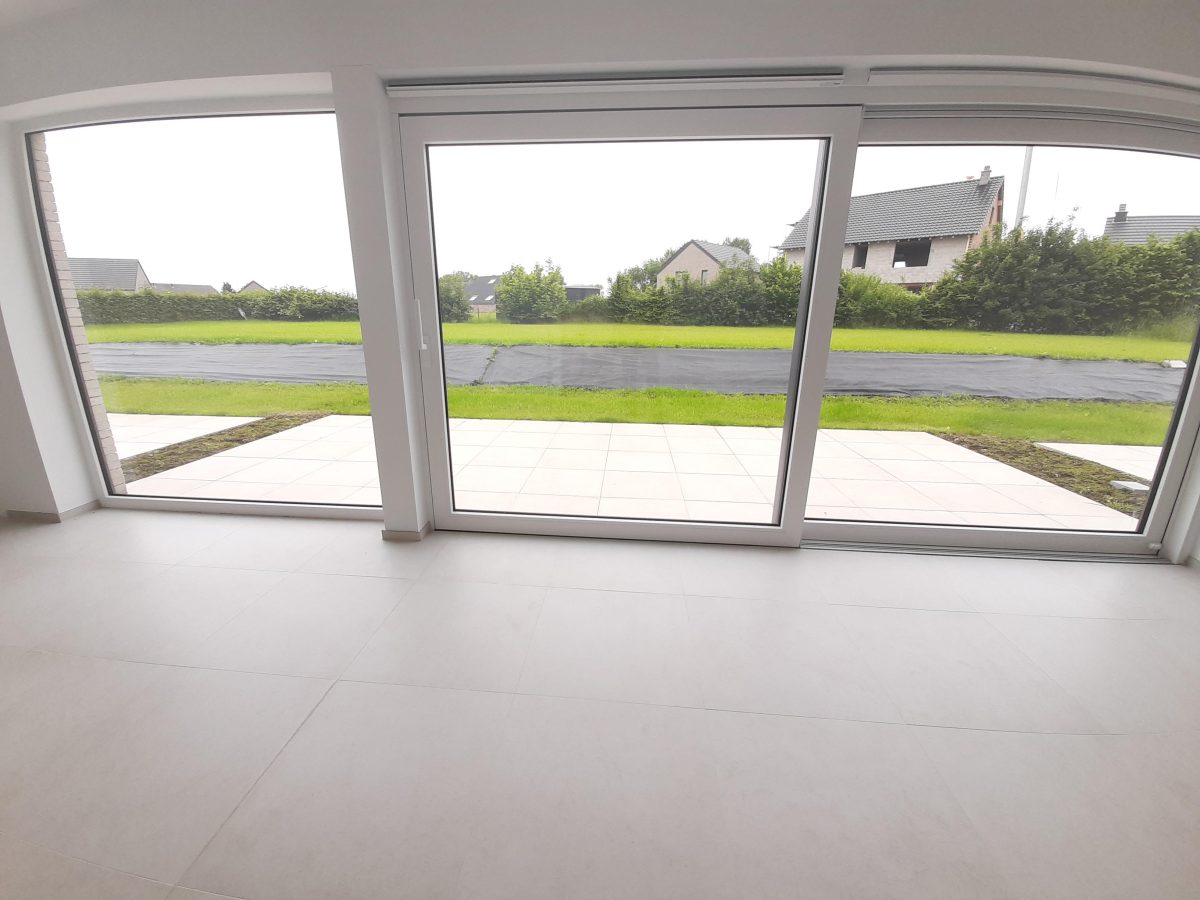 Wunderschönes neues Reihenhaus nach modernsten Standards gebaut. Es handelt sich um einen Neubau auf einem cirka 300 m² grossen Baugrundstück und ausgestattet mit allen modernen technischen Anforderungen, wie zum Beispiel mechanische Lüftung, Regenwasserzisterne von 10 000 Liter, Gaskondensatortherme, Isolation, usw. Alle Böden sind komplett gefliest, das Haus hat ebenfalls eine geflieste Terrasse sowie einen mit Bodenklinkern ausgelegten Weg zum Eingang und zur Garage. Alle Wände sind weiss gestrichen. Kommen wir nun zur Raumaufteilung, auf dem Erdgeschoss befindet die Eingangdiele mit Gäste-WC und dem Zugang zum wunderbar lichtdurchflutenten Wohn-, Esszimmer mit offener Küche, die einen sehr schönen Blick auf die Terrasse bietet. Der Rest dieses sehr grossen Zimmers (etwa 50 m²) erstreckt sich über die gesamte Länge des Hauses, sodaß man von der Terrasse einen direkten Blick auf die Strasse haben kann, sofern man dies möchte. Eine wunderschöne Marmortreppe mit solider Glaswand, führt Sie auf die erste Etage mit Nachtflur mit offenem Arbeits- oder Freizeitraum, drei geräumigen Schlafzimmern wovon ein Zimmer noch über enen Ankleideraum verfügt, die wie schon erwähnt, mit Bodenfliesen, die einen Parkettbelag imitieren, ausgelegt sind. Ein weiteres Highlight ist das moderne Bad mit bodenebener italienischer Dusche, WC und Doppelwaschtisch. Selbstverständlich verfügt dieses Haus ebenfalls über einen nach Süden ausgerichteten Balkon. Ein grosser Speicher eignet sich hervorragend dazu, nicht oft benötigte Utensilien zu lagern. Das Haus verfügt natürlich über eine mit einem elektrischen Sektionaltor geschlossene Garage mit Zugang zum Garten und einen Hauswirtschaftsraum mit Waschmaschinenanschluss. Dieser Raum befindet sich zwischen Küche und Garage, sodaß dort ebenfalls alle nötigen Vorräte zwischengelagert werden können. Sehr schöne Lage am Stadtrand von Welkenraedt und fantastischer Weitblick.