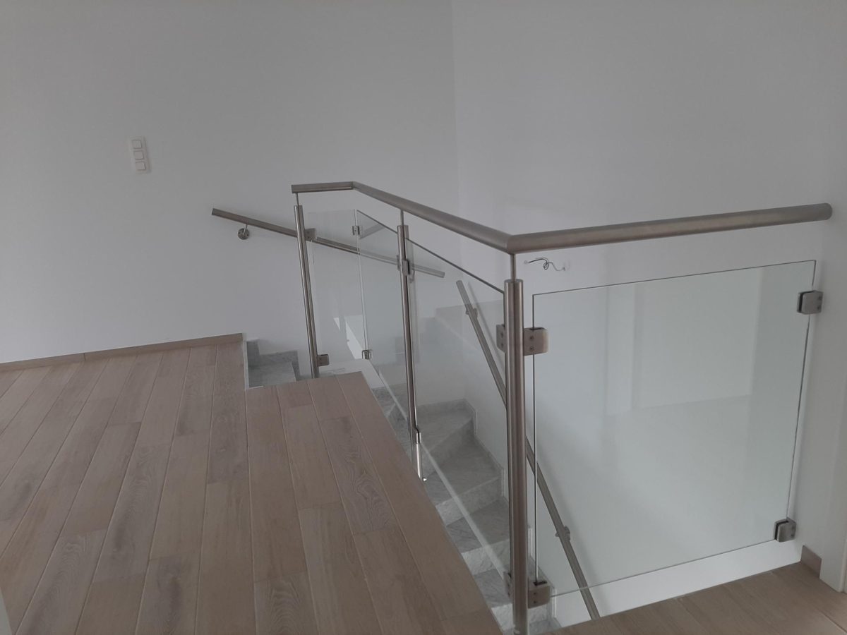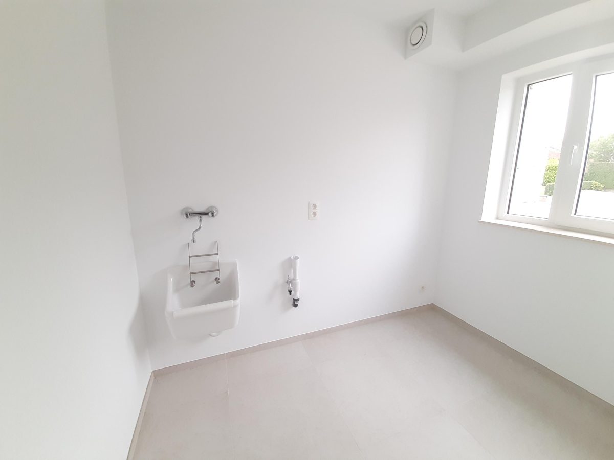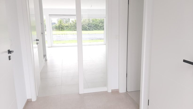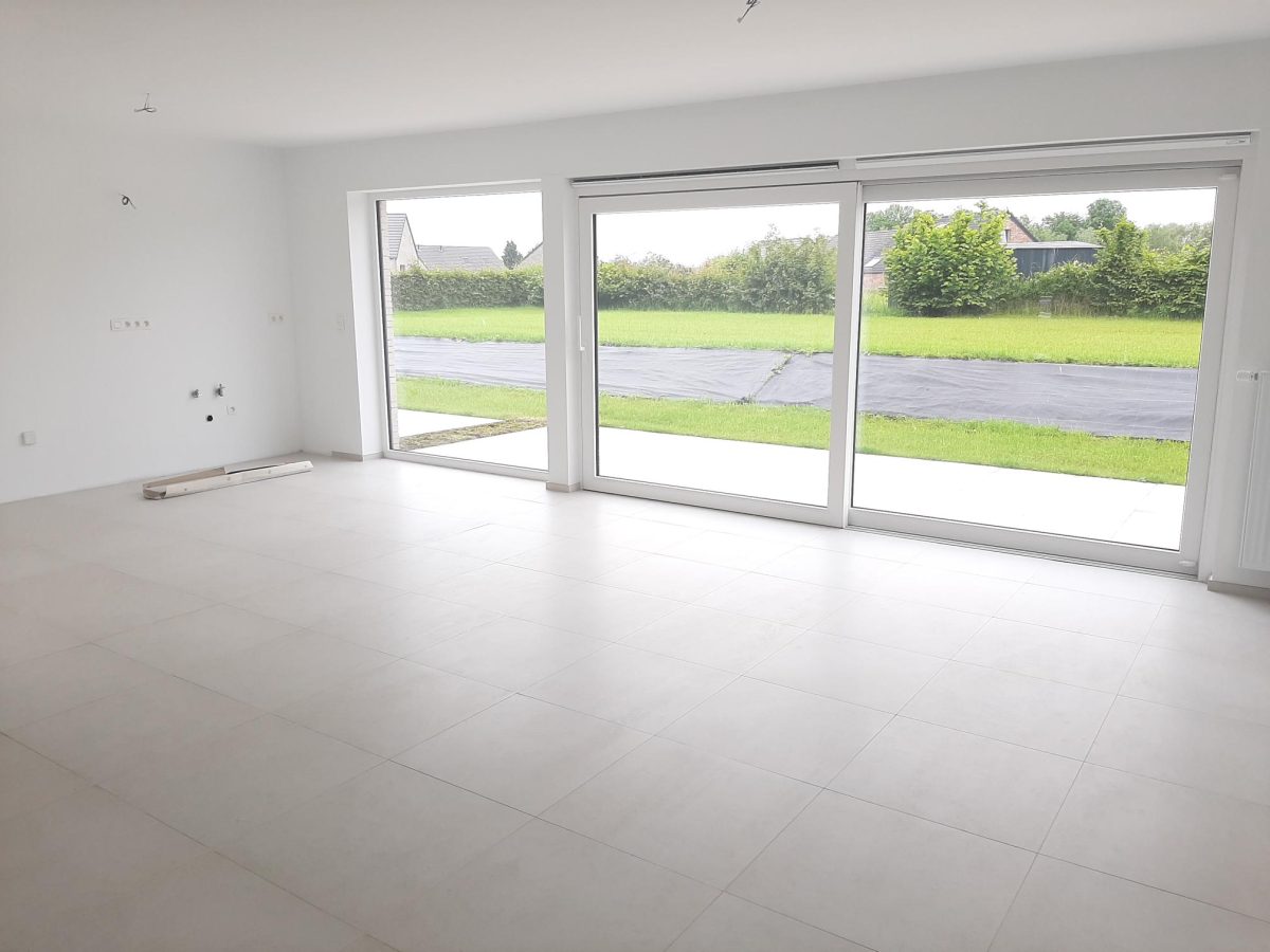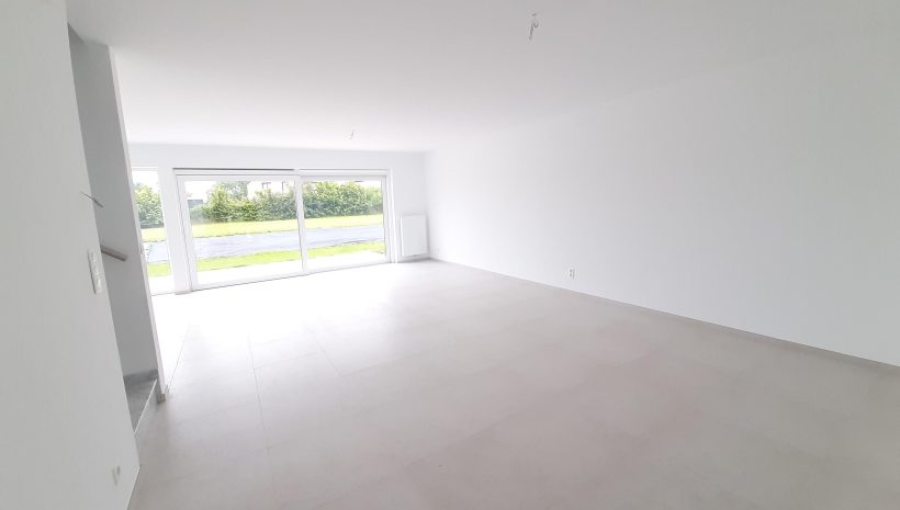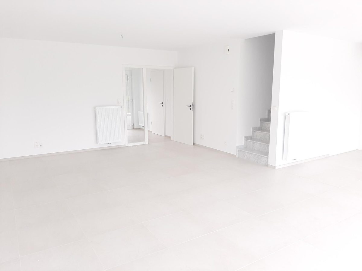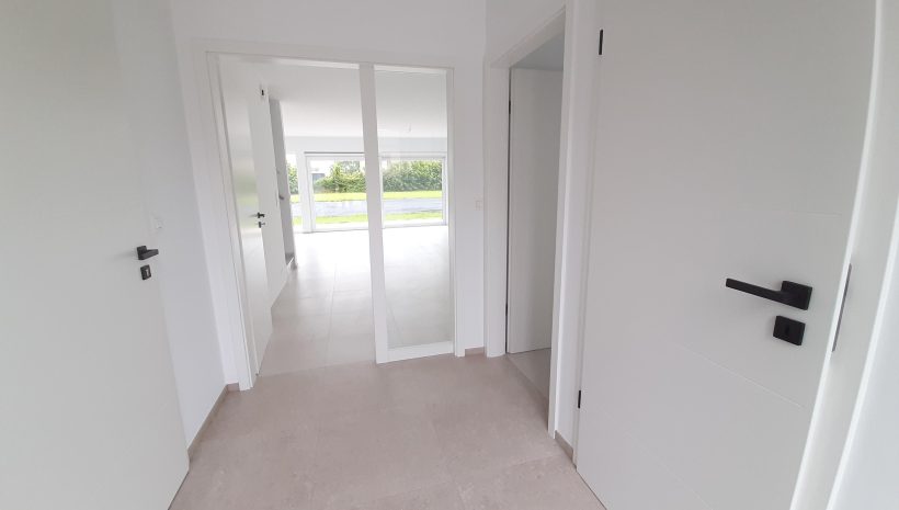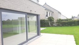 Wunderschönes neues Reihenhaus nach modernsten Standards gebaut. Es handelt sich um einen Neubau auf einem cirka 300 m² grossen Baugrundstück und ausgestattet mit allen modernen technischen Anforderungen, wie zum Beispiel mechanische Lüftung, Regenwasserzisterne von 10 000 Liter, Gaskondensatortherme, Isolation, usw. Alle Böden sind komplett gefliest, das Haus hat ebenfalls eine geflieste Terrasse sowie einen mit Bodenklinkern ausgelegten Weg zum Eingang und zur Garage. Alle Wände sind weiss gestrichen. Kommen wir nun zur Raumaufteilung, auf dem Erdgeschoss befindet die Eingangdiele mit Gäste-WC und dem Zugang zum wunderbar lichtdurchflutenten Wohn-, Esszimmer mit offener Küche, die einen sehr schönen Blick auf die Terrasse bietet. Der Rest dieses sehr grossen Zimmers (etwa 50 m²) erstreckt sich über die gesamte Länge des Hauses, sodaß man von der Terrasse einen direkten Blick auf die Strasse haben kann, sofern man dies möchte. Eine wunderschöne Marmortreppe mit solider Glaswand, führt Sie auf die erste Etage mit Nachtflur mit offenem Arbeits- oder Freizeitraum, drei geräumigen Schlafzimmern wovon ein Zimmer noch über enen Ankleideraum verfügt, die wie schon erwähnt, mit Bodenfliesen, die einen Parkettbelag imitieren, ausgelegt sind. Ein weiteres Highlight ist das moderne Bad mit bodenebener italienischer Dusche, WC und Doppelwaschtisch. Selbstverständlich verfügt dieses Haus ebenfalls über einen nach Süden ausgerichteten Balkon. Ein grosser Speicher eignet sich hervorragend dazu, nicht oft benötigte Utensilien zu lagern. Das Haus verfügt natürlich über eine mit einem elektrischen Sektionaltor geschlossene Garage mit Zugang zum Garten und einen Hauswirtschaftsraum mit Waschmaschinenanschluss. Dieser Raum befindet sich zwischen Küche und Garage, sodaß dort ebenfalls alle nötigen Vorräte zwischengelagert werden können. Sehr schöne Lage am Stadtrand von Welkenraedt und fantastischer Weitblick.