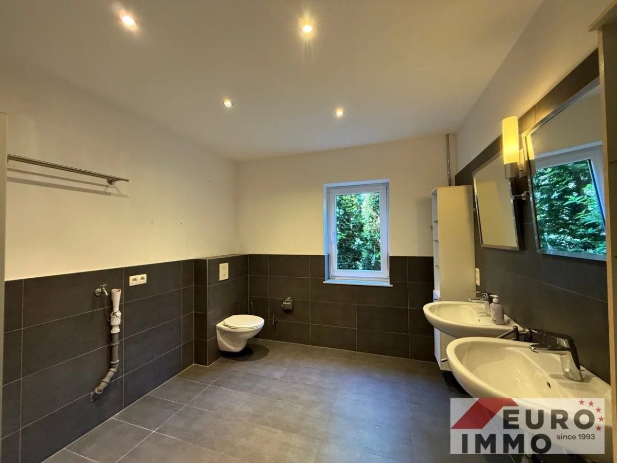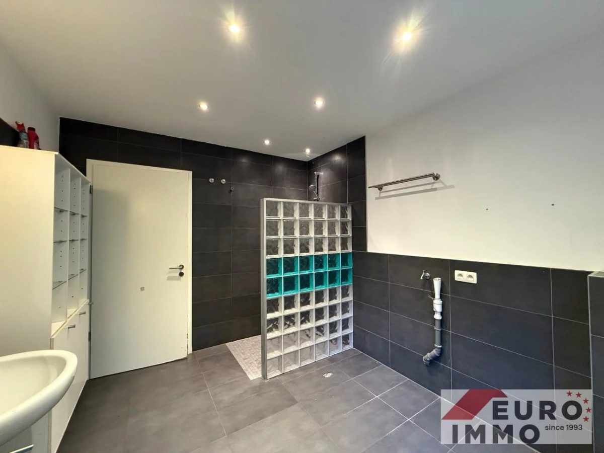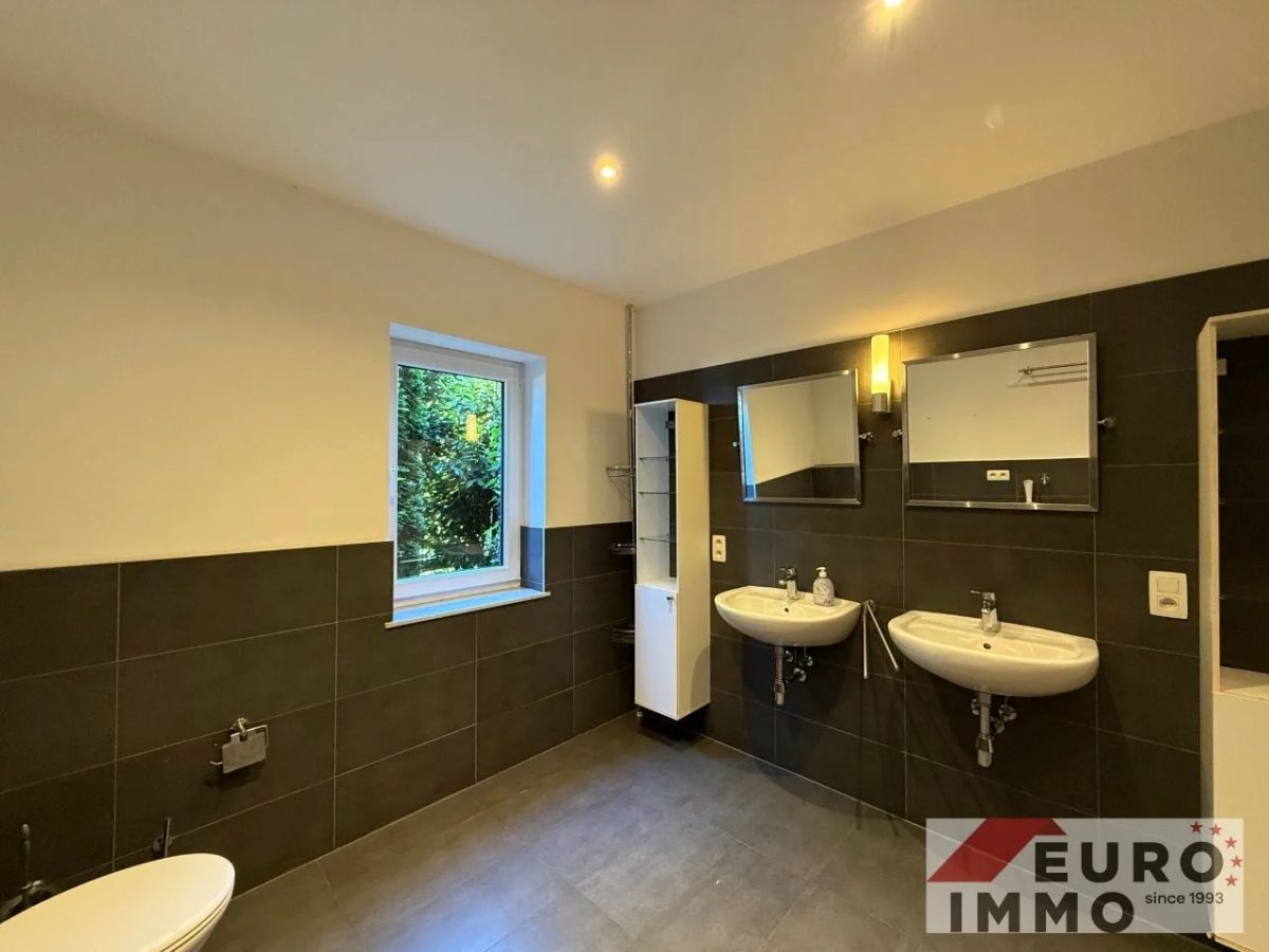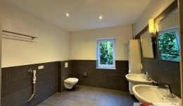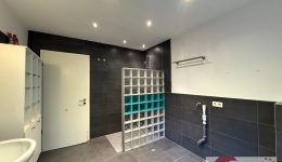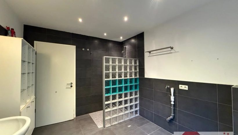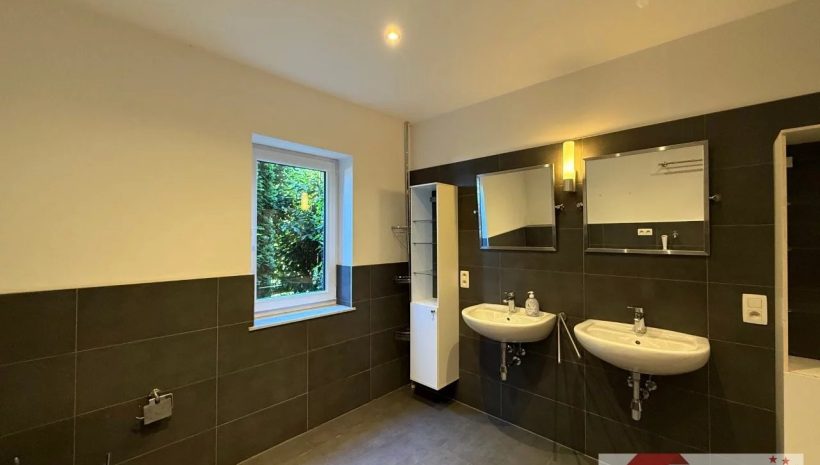 Noch ein paar Stufen tiefer beginnt der moderne, neu gebaute Wohnbereich. Hier überzeugt ein stilvoll gefliestes Badezimmer (ca. 8,5 m²) in Grautönen – mit bodengleicher Dusche, Doppelwaschbecken, WC und Anschluss für die Waschmaschine. Direkt in Verbindung liegt ein ruhiges Schlafzimmer (ca. 20 m²) mit bodentiefen Fenstern und Zugang zum Garten – ein Ort der Stille, perfekt zum Abschalten.