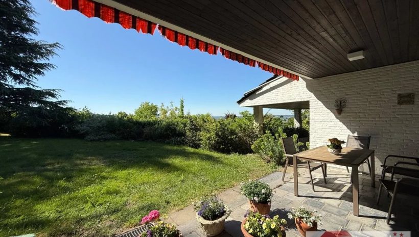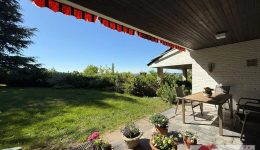 Angrenzend liegt die überdachte Terrasse (ca. 20 m²) – mit Natursteinbelag, offenem Kamin und Südausrichtung – ein Ort für laue Sommerabende, goldene Herbstnachmittage oder stimmungsvolle Winterabende. Dank Markise und Überdachung lässt sich dieser Bereich das ganze Jahr über genießen.
