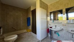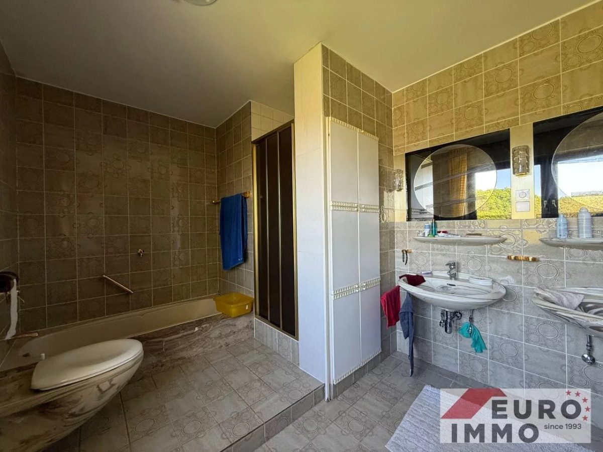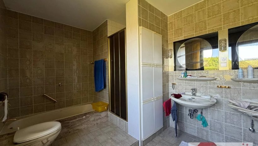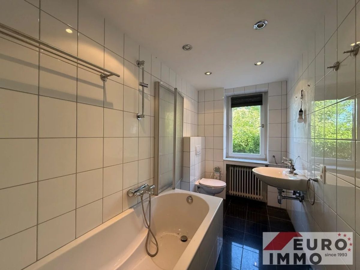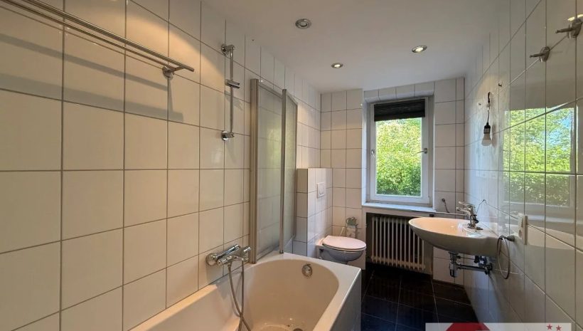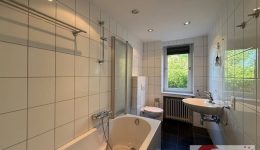 Das dazugehörige Badezimmer (ca. 10 m²), im Stil des Baujahrs, ist gepflegt und voll funktional. Es bietet Badewanne, Dusche, WC, Doppelwaschbecken sowie einen praktischen Einbauschrank – bereit für ein stilvolles Update oder sofortigen Gebrauch.