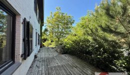 Besonders einladend wirkt das zweite Schlafzimmer auf dieser Ebene – mit seinen ca. 21 m², Zugang zur seitlichen Terrasse mit Bankirai-Holzbelag (ca. 14 m²) und angrenzender gefliester Fläche (ca. 18 m²) bietet es einen wunderbaren Rückzugsort mit direktem Gartenzugang. Ein Ort für Sommersonne am Morgen, einen Kaffee im Freien oder ganz einfach: Zeit für sich.