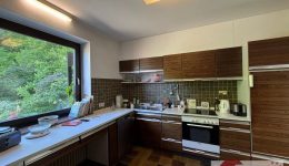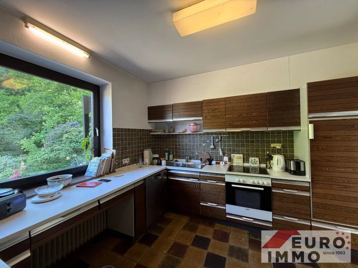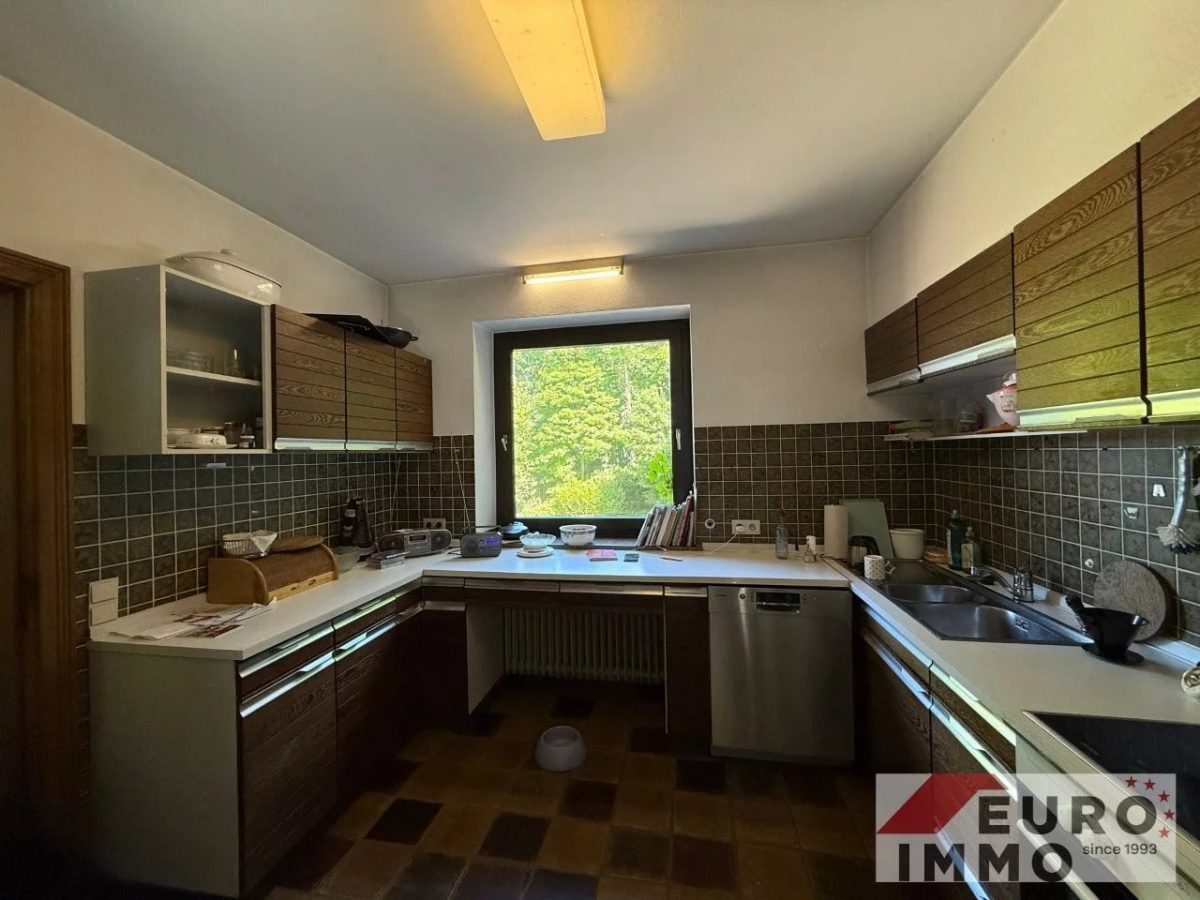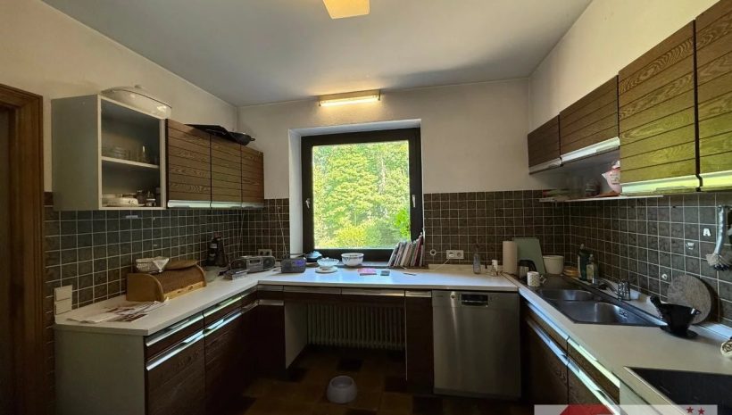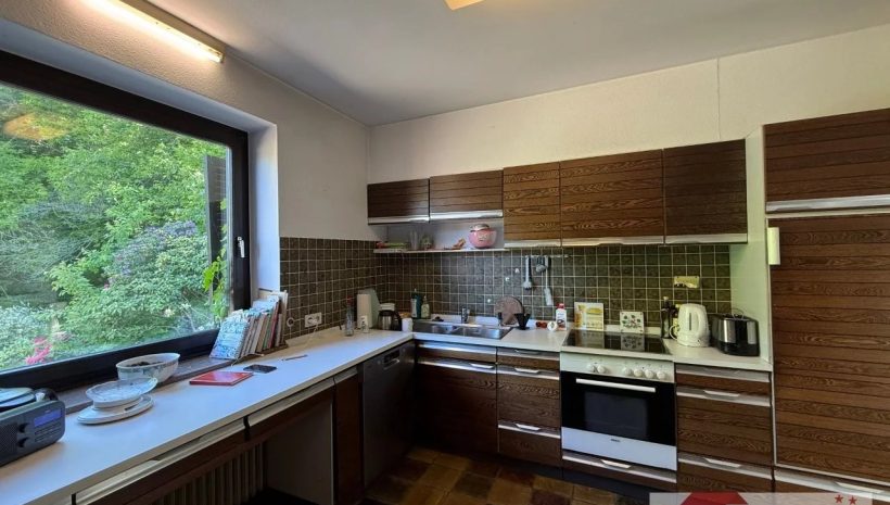 Die Küche (ca. 10 m²) ist in ihrem ursprünglichen Zustand erhalten, funktionstüchtig und bereit für neue Ideen. Mit warmen Naturfliesen ausgestattet und Blick in den Garten, lädt sie ein zur Einrichtung einer gemütlichen Essecke – ein Ort für Frühstücke mit Morgensonne und guten Gesprächen.