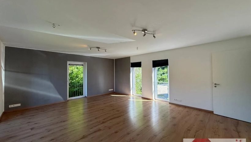 Das wahre Herzstück aber ist das Wohnzimmer: Ein großzügiger Raum mit weitem Blick ins Grüne, der durch seine klare Architektur, den edlen Blausteinboden und den integrierten Unterflurkonvektor zum Wohlfühlen einlädt. Hier lassen sich verschiedene Wohnideen verwirklichen – mit Ausblick, Ruhe und Charakter.