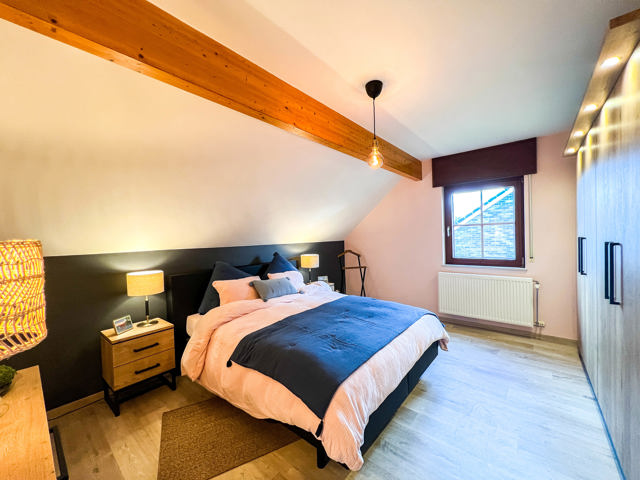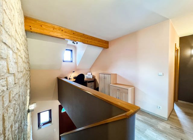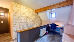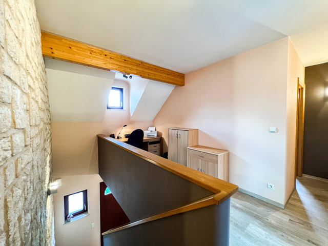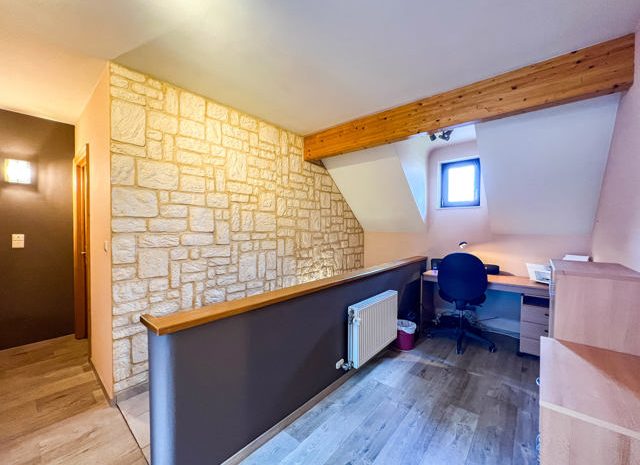 Im Obergeschoss befinden sich ein Bürobereich, vier komfortable Schlafzimmer mit 15 m², 11 m², 14 m² und 17 m² sowie ein Badezimmer mit Badewanne und Dusche. Holzrahmenfenster mit Doppelverglasung, Rollläden, Sonnenmarkise und eine bis 2026 konforme Elektrik zeugen von guter Pflege.