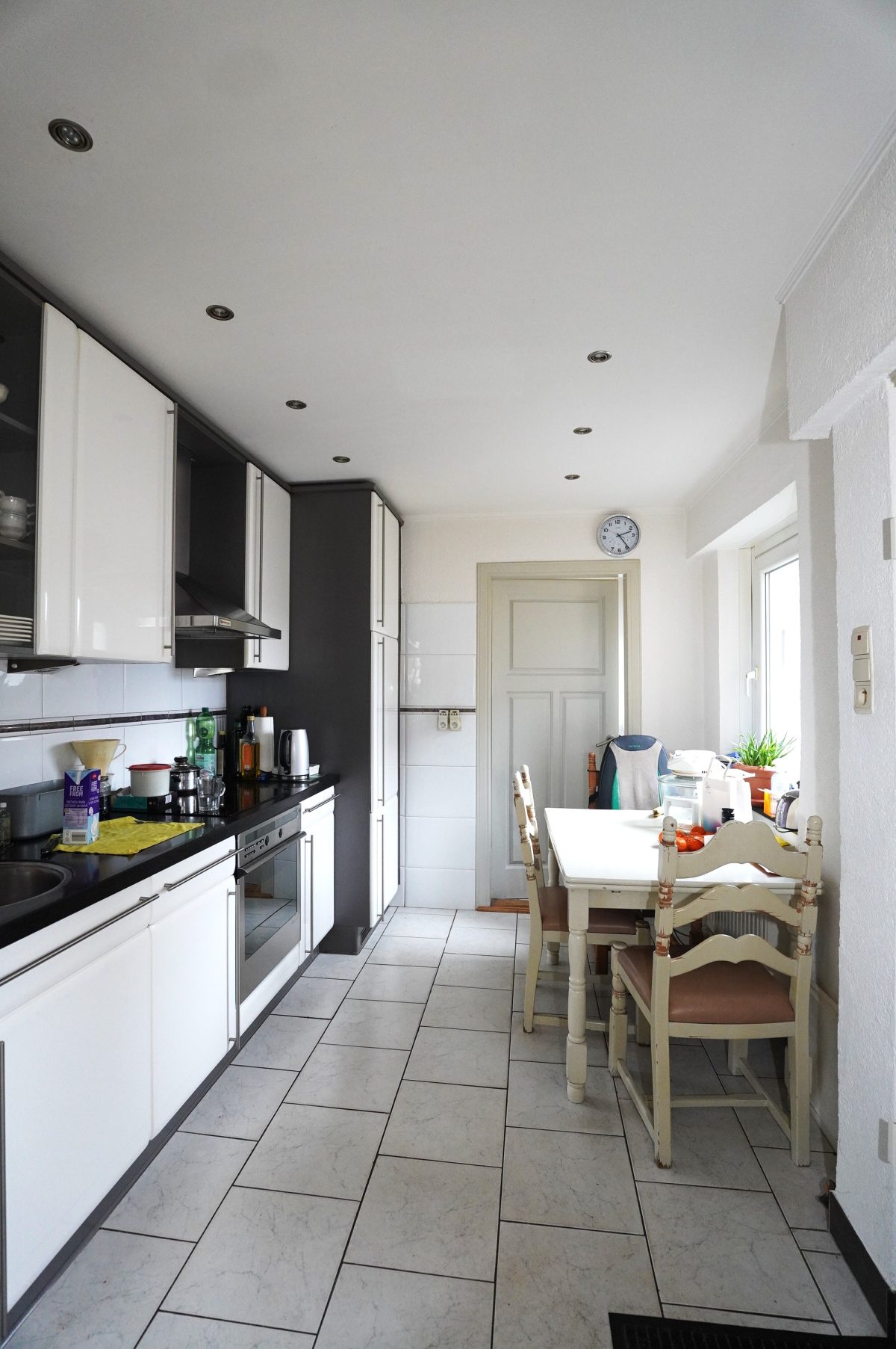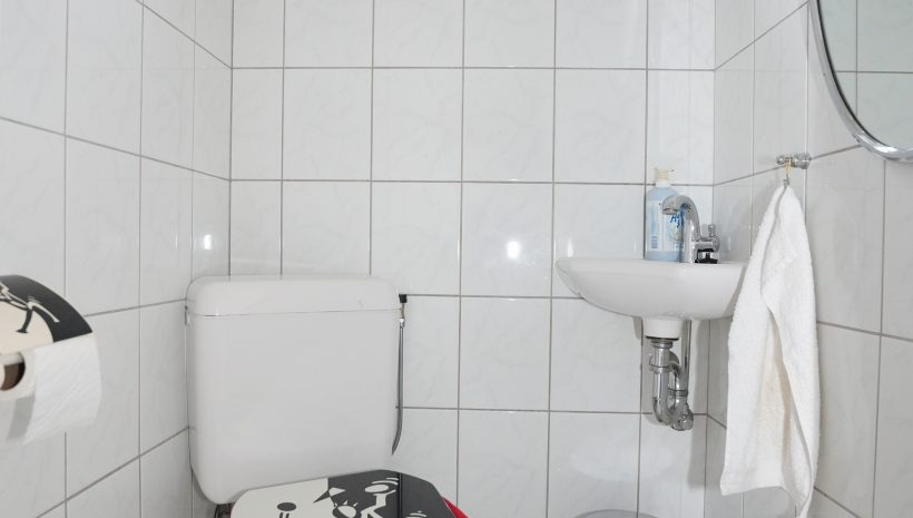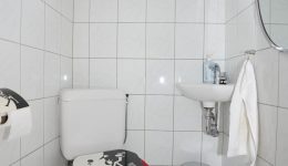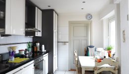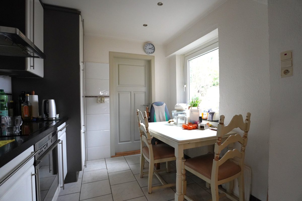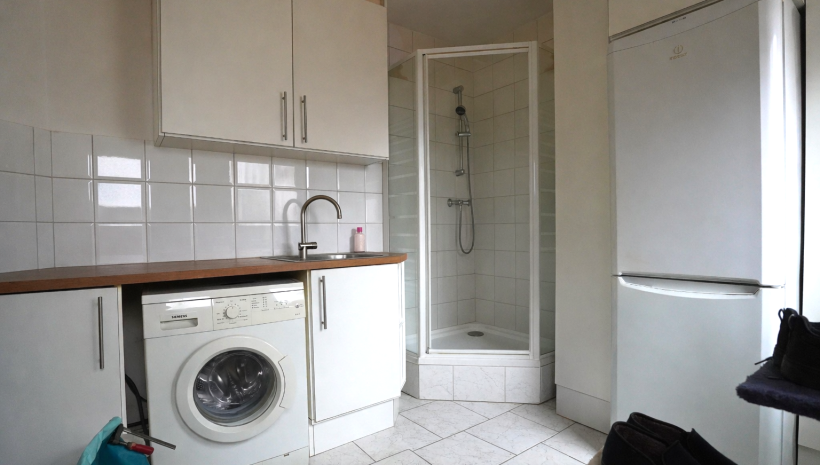 Die Küche bietet sowohl Zugang zum Außenbereich als auch zum Hauswirtschaftsraum, der zusätzlich mit einer Dusche sowie Anschlüssen für eine Waschmaschine versehen ist.