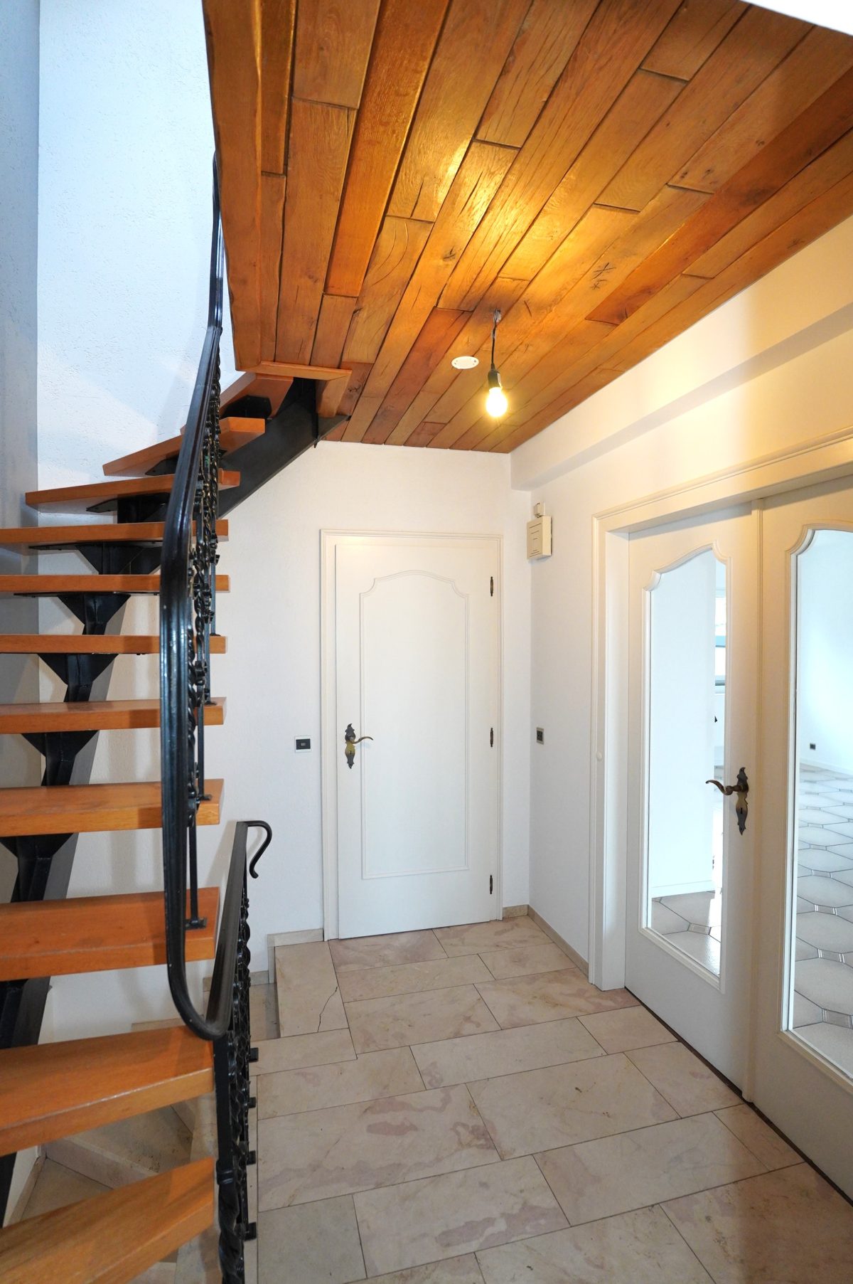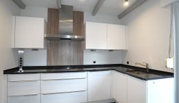 Gartenniveau: Flur mit Garderobe, Treppenhaus, separates WC, großes Wohnzimmer zugänglich durch eine Holztür, schöne ausgestattete Küche mit Zugang zur großzügigen Terrasse mit Grill.