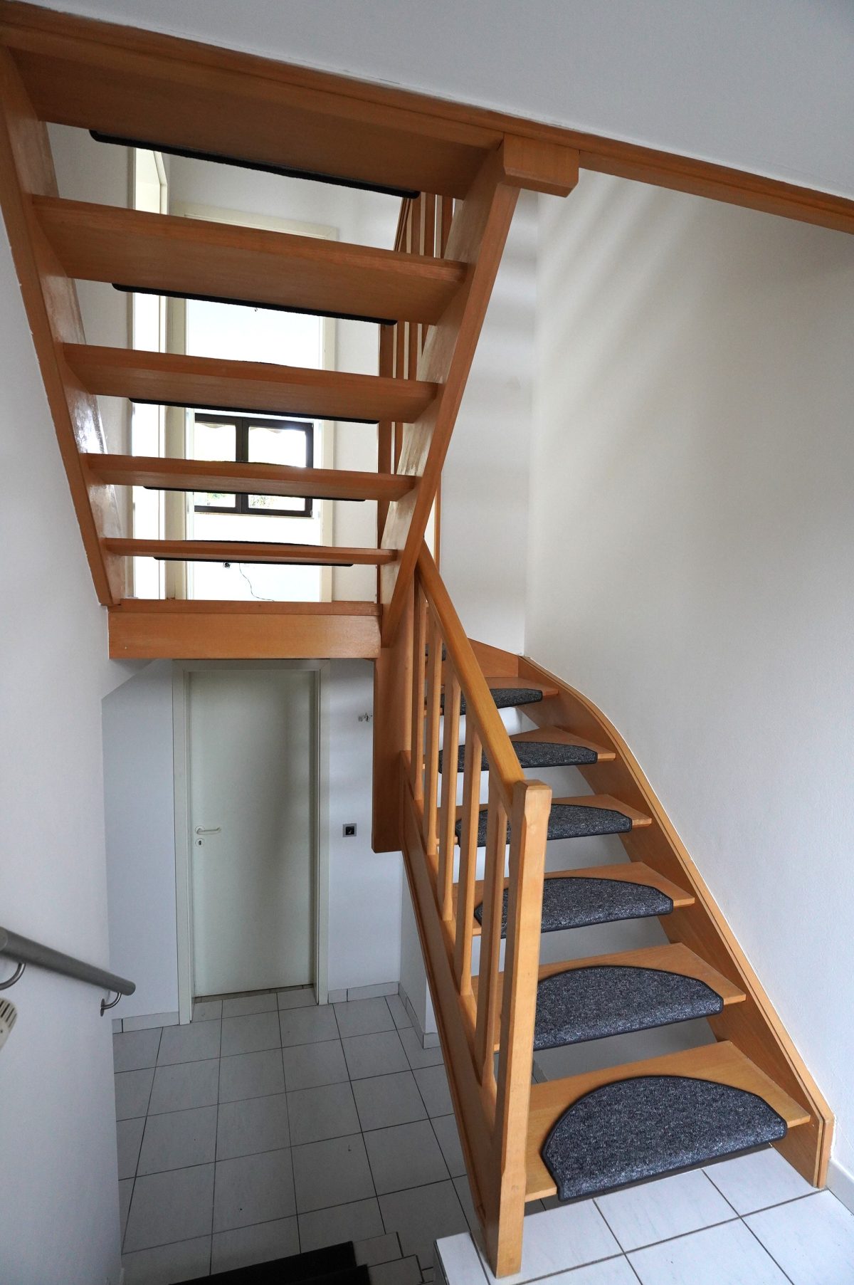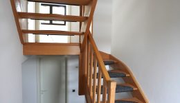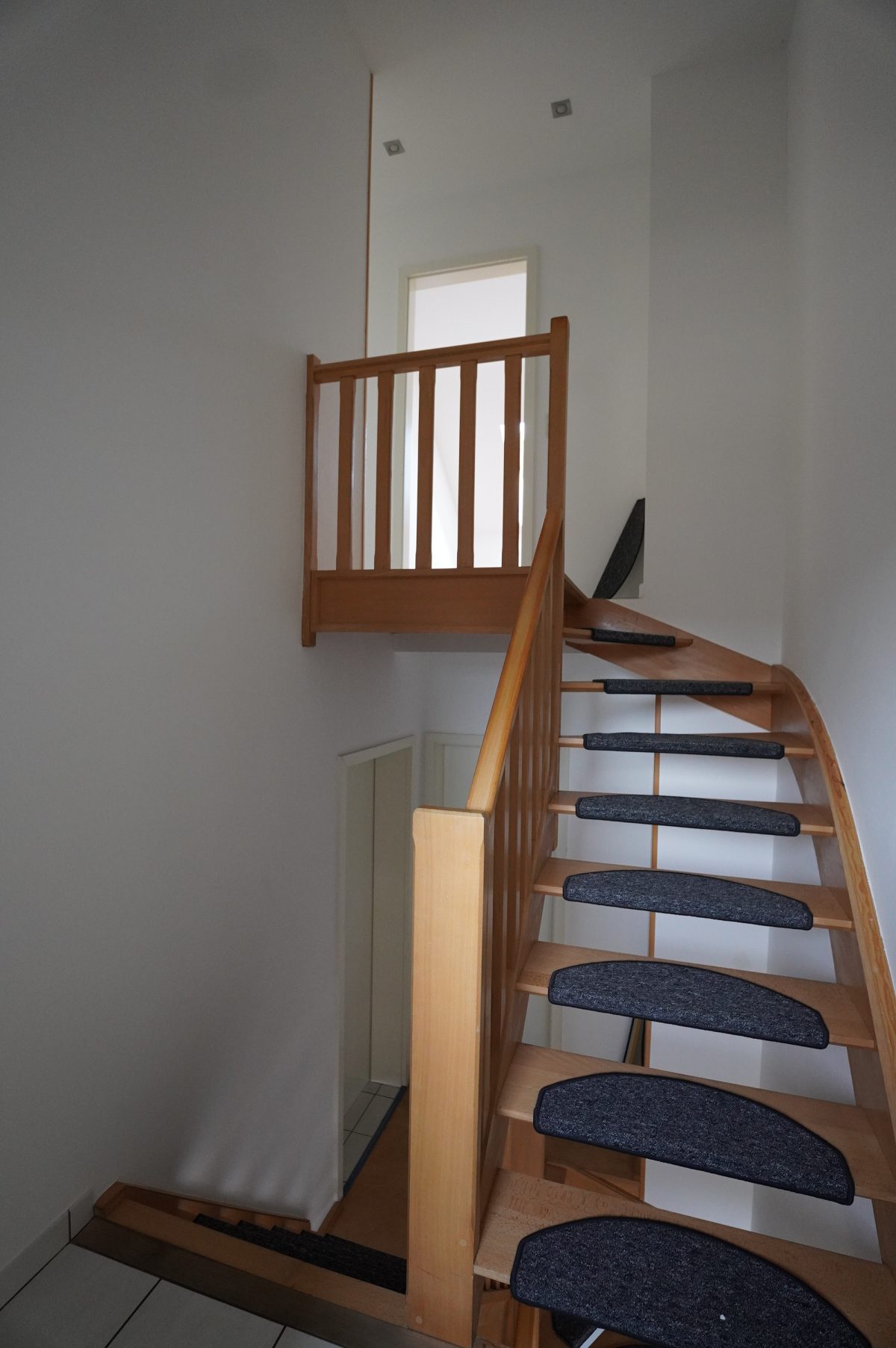 Eingangsdiele mit schöner Holztreppe, die Zugang zum geräumigen und lichtdurchfluteten Wohnzimmer sowie zum vorgesehenen Küchenbereich führt.