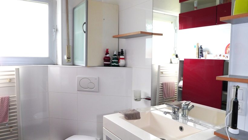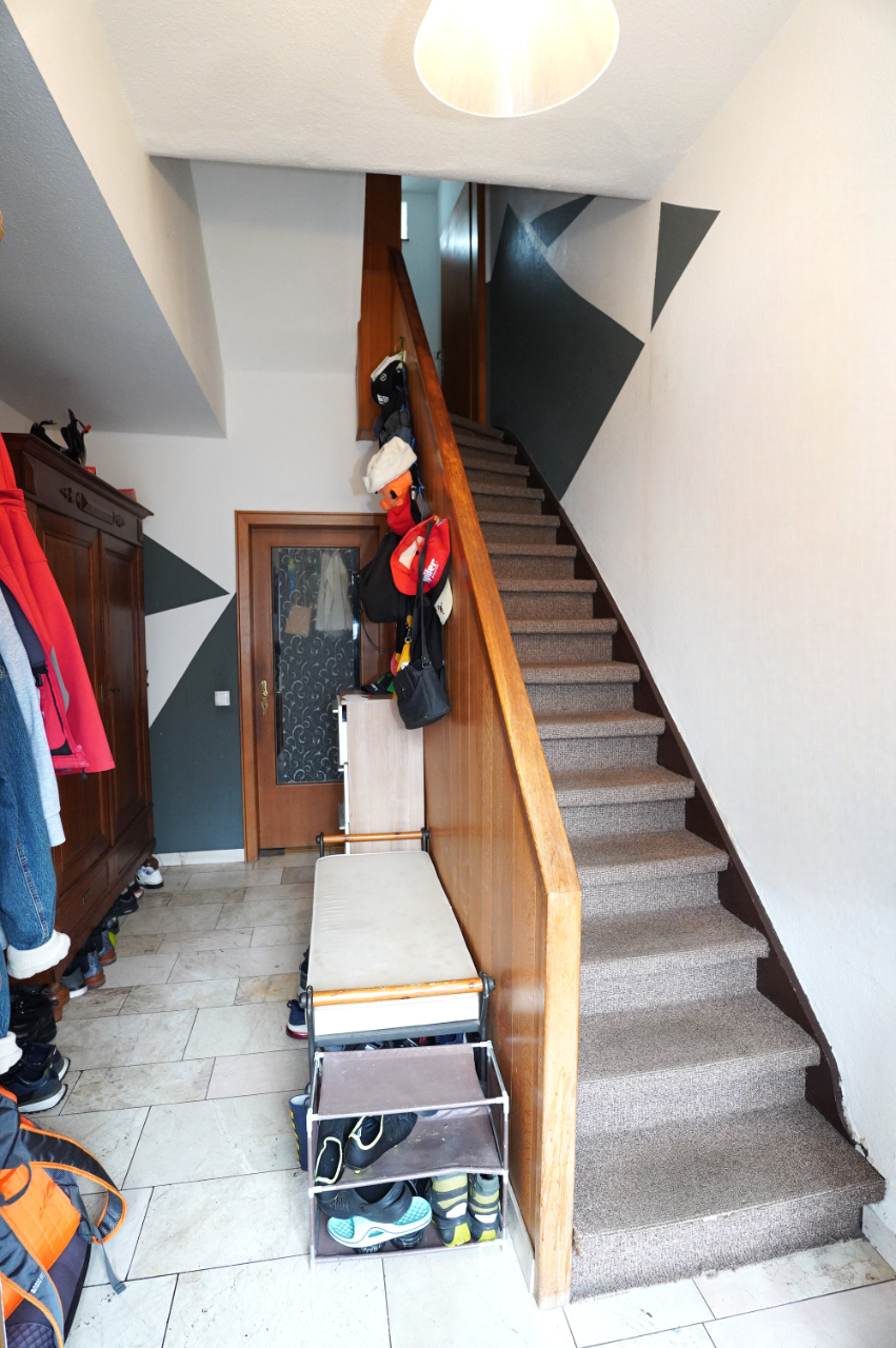 Keller: Flur mit Treppe, ein Kellerraum, Heizungskeller mit der zentralen Stadtgasheizung, Hauswirtschaftsraum mit separatem WC und Anschluss für die Waschmaschine, weiterer Abstellkeller, eine ältere kleine Garage mit Zugang zum Garten.