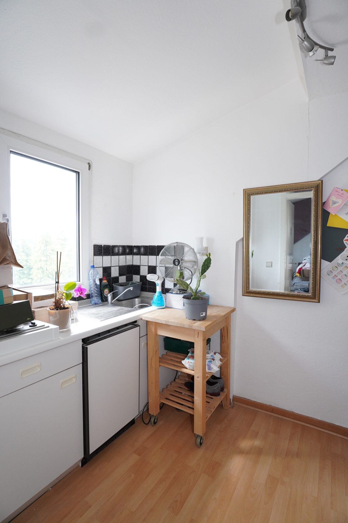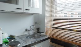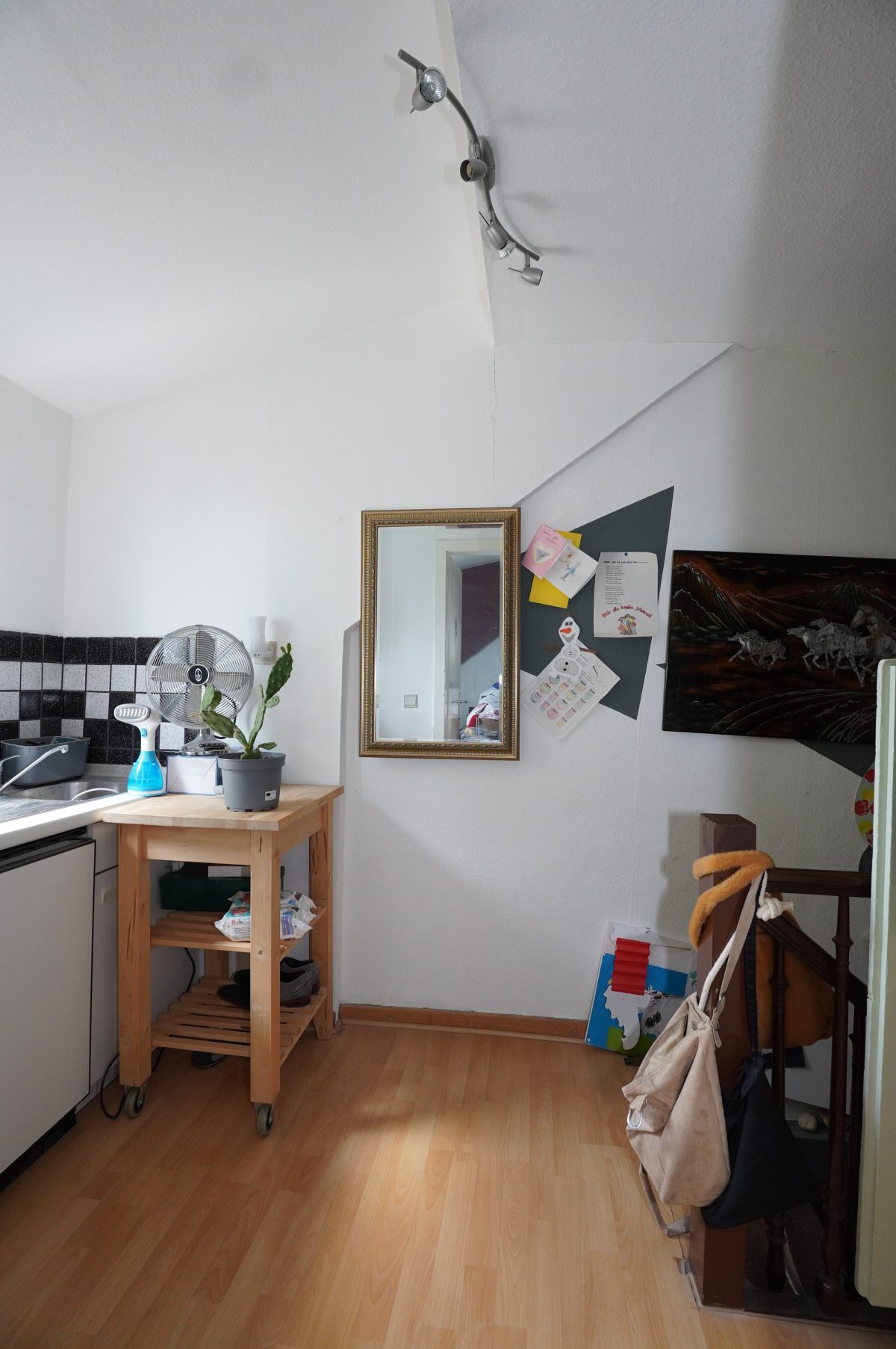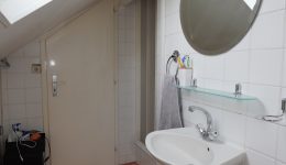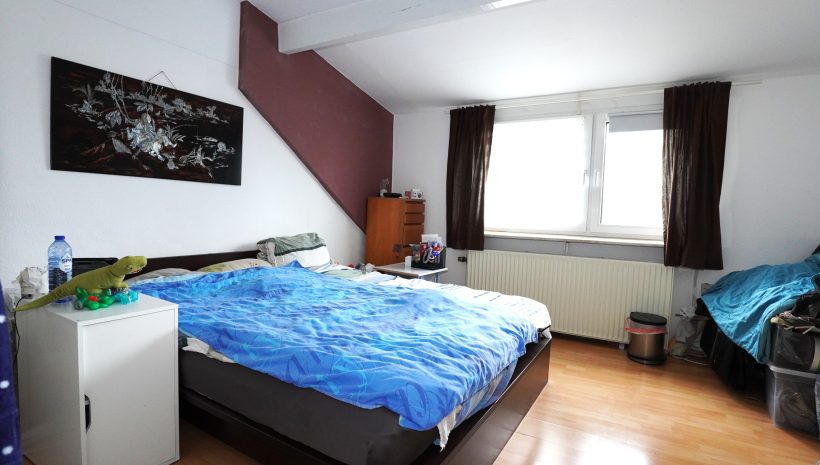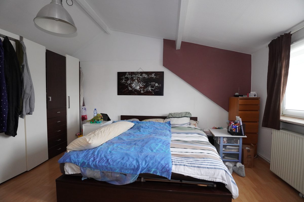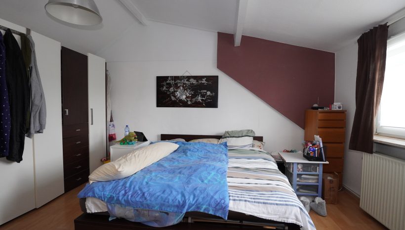 2. Etage: Flur mit Kochnische, ein geräumiges Schlafzimmer mit Einbauschrank, ein Duschbad mit WC, Dusche und Waschbecken.