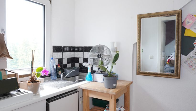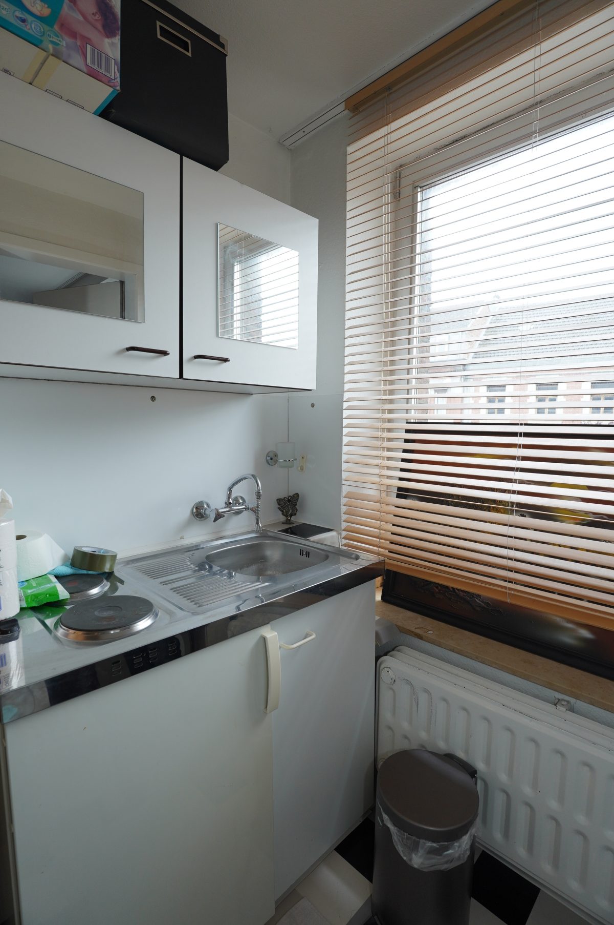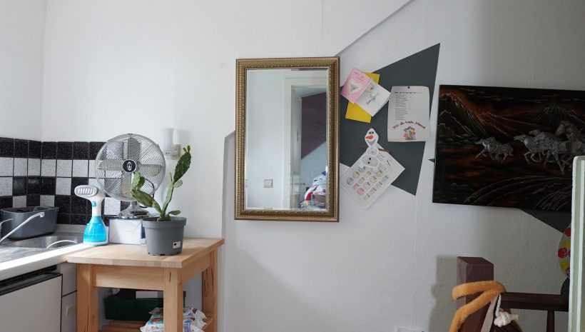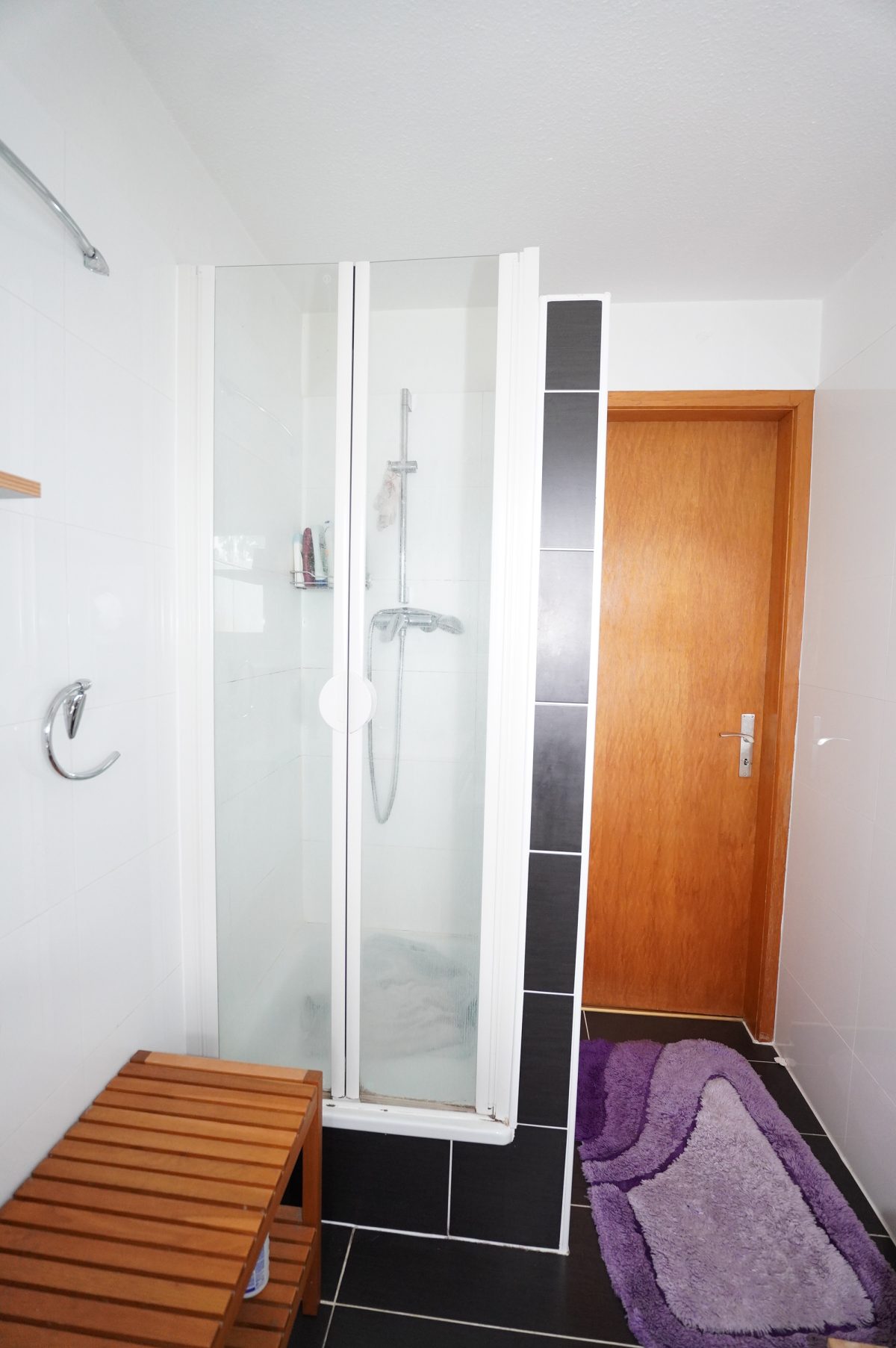 2. Etage: Flur mit Kochnische, ein geräumiges Schlafzimmer mit Einbauschrank, ein Duschbad mit WC, Dusche und Waschbecken.