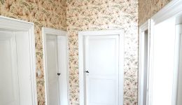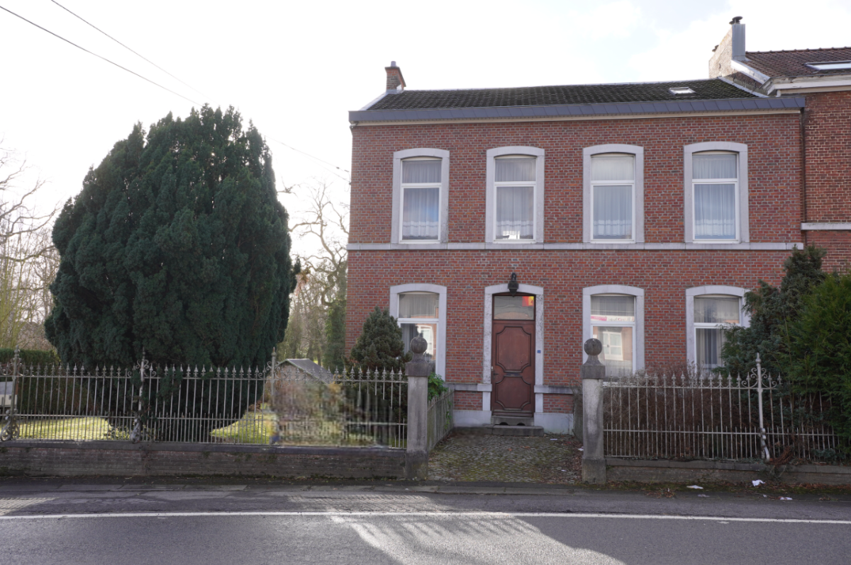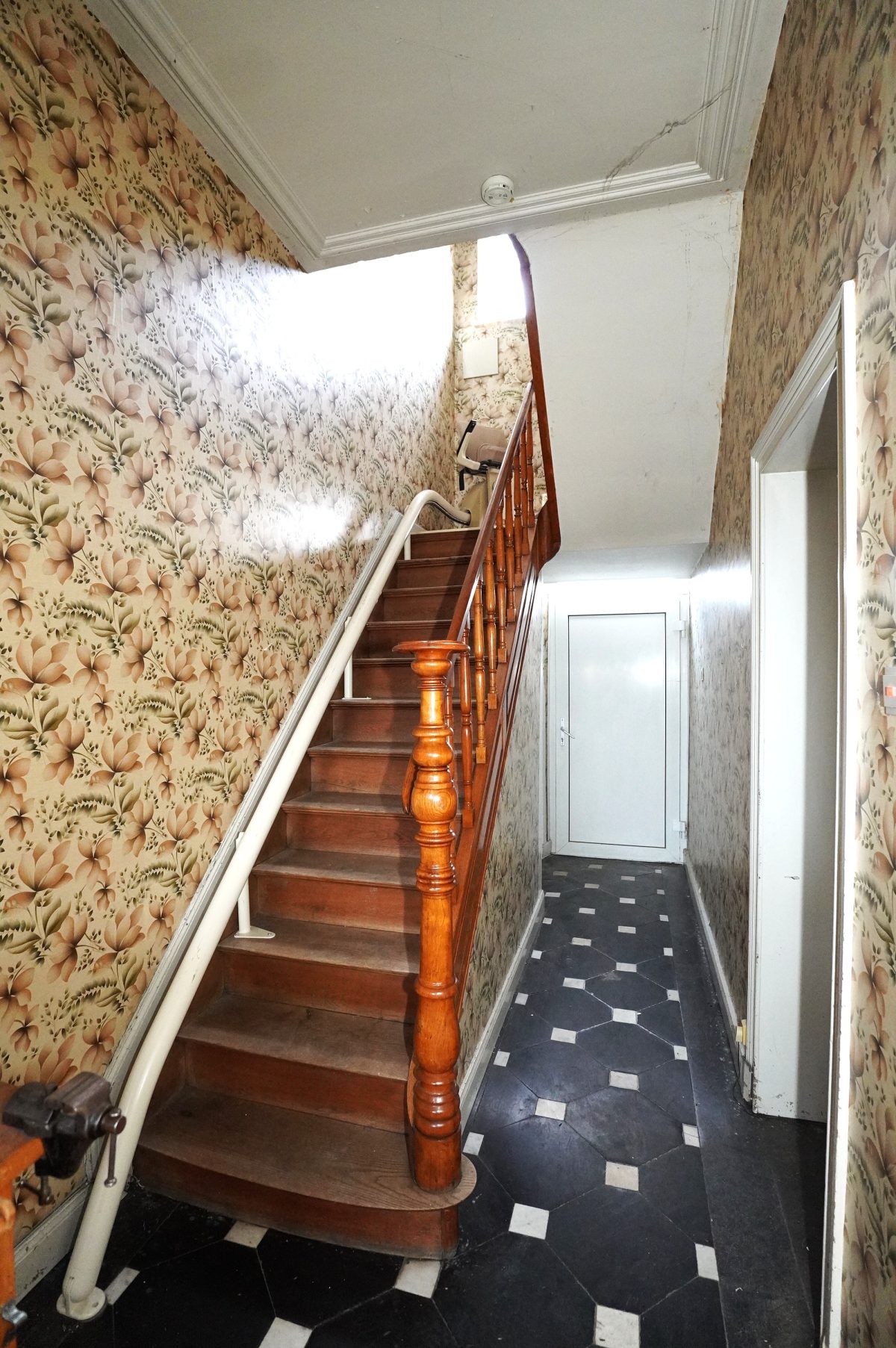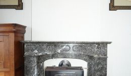 Die Einfahrt führt über zwei Stufen aus Blaustein zur schönen Holztür. Dieses natürliche Material findet sich auch in der Fassade wieder, sei es um die Fenster und Türen herum oder an der Straßenfront, wo der schmiedeeiserne Zaun den Vorgarten des Anwesens umschließt.