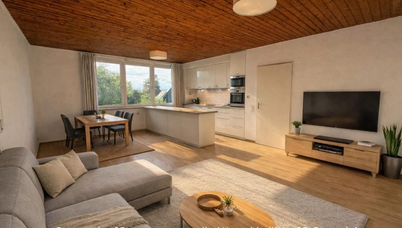 Das Herzstück der Wohnung bildet der großzügige Wohn- und Essbereich von rund 30 m², der durch seine charmante, braun-rot gefärbte Holzdecke und die großen Fenster besticht. Diese lassen nicht nur viel Tageslicht herein, sondern eröffnen auch einen beruhigenden Blick ins Grüne – der perfekte Ort, um gemütliche Stunden zu verbringen.