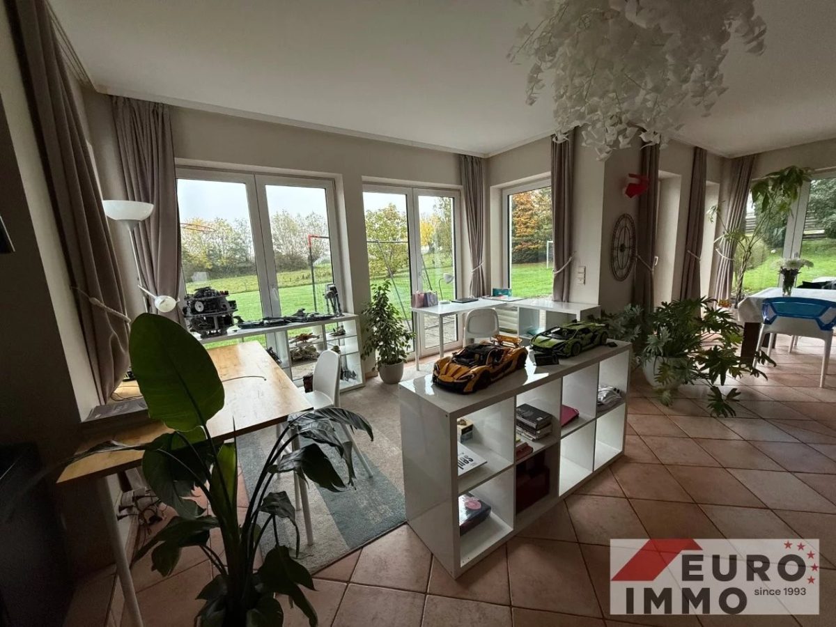 Die leicht erhöhte, durch eine Stufe abgetrennte Bibliotheksecke schafft eine angenehme Raumdynamik und lädt zum Entspannen ein. In der Wohnküche sorgt eine moderne, zeitlose Einbauküche für Stil und Funktionalität. Von hier aus öffnet sich der Blick auf weite Felder – der perfekte Ort für gemeinsame Mahlzeiten mit Aussicht. Dank der Größe findet auch ein Esstisch bequem Platz. Der gesamte Wohnbereich ist ebenfalls mit pflegeleichten Terracotta-Fliesen ausgestattet.