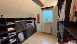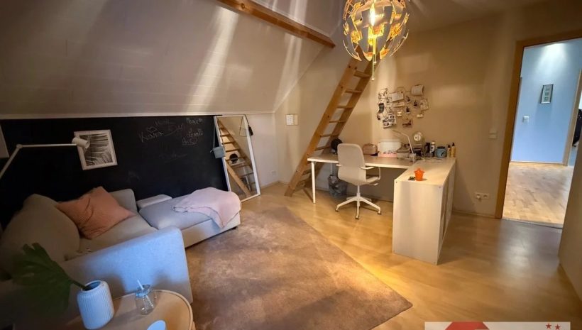 Das Obergeschoss bietet viel Raum für Privatsphäre und Rückzug. Direkt oben angekommen, empfängt Sie ein offener Raum von ca. 26 m² mit Parkettboden – ideal als zweiter Wohnbereich, Büro oder Leseecke. Die großzügige Fenstergaube mit bodentiefem Fenster öffnet den Blick auf die grüne Umgebung und schafft eine Atmosphäre der Ruhe und Weite – ein Ort zum Durchatmen.