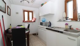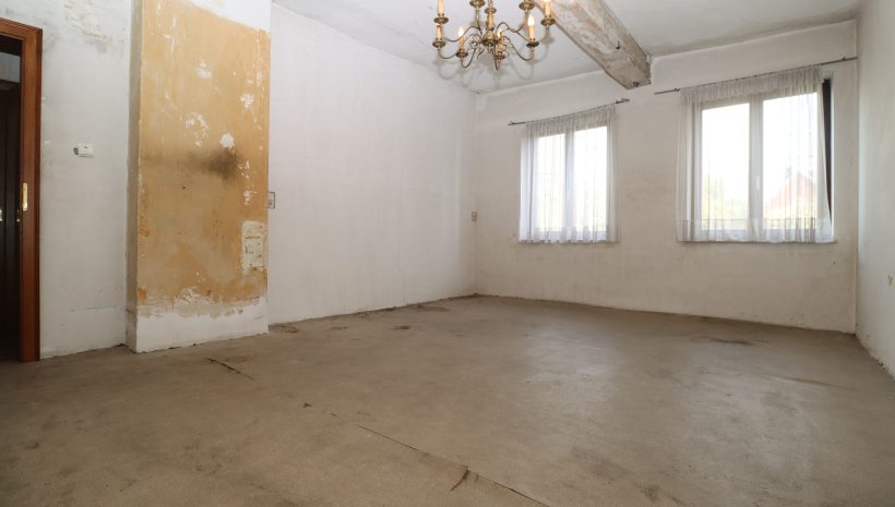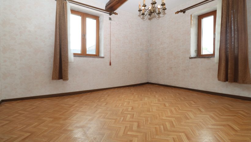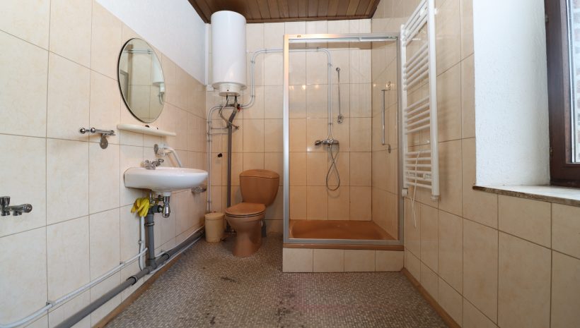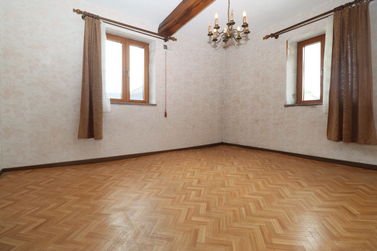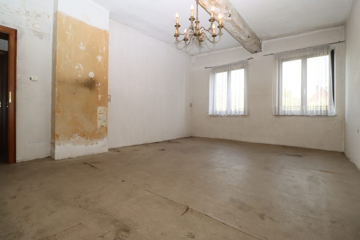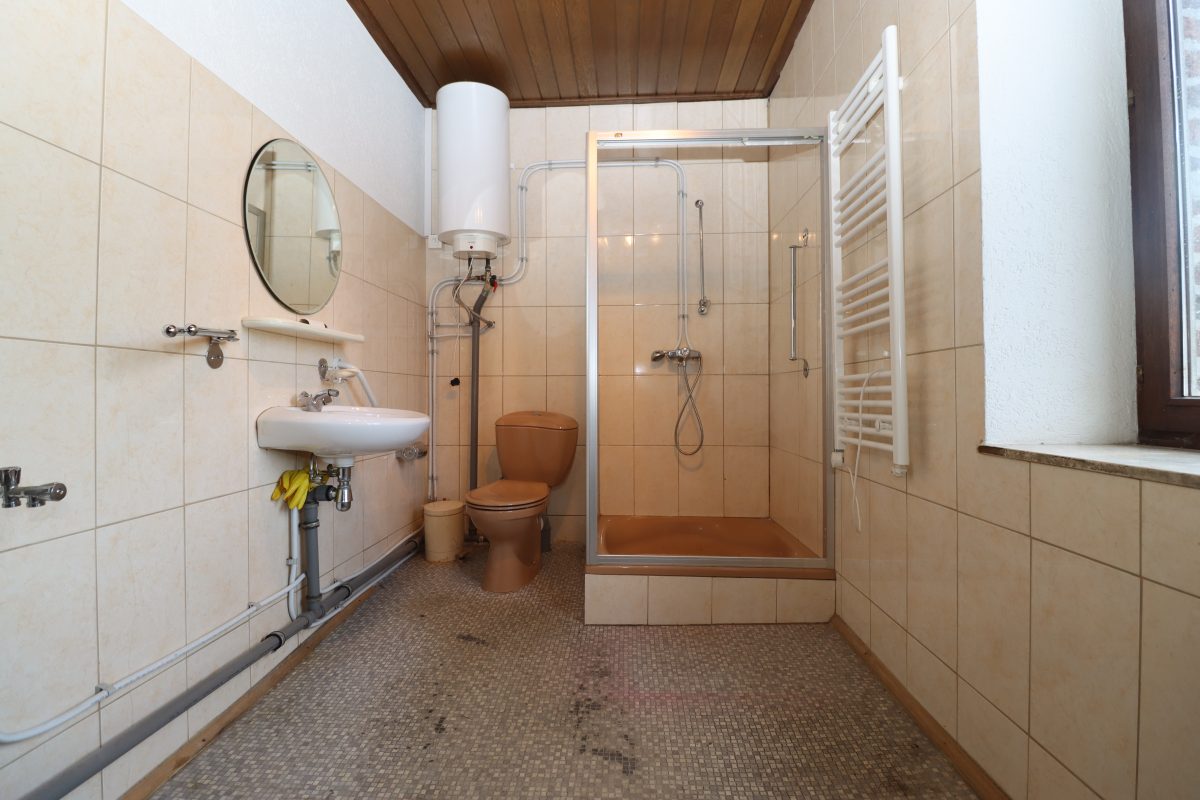 • Erste Etage: Auf der ersten Etage befindet sich der Wohnbereich. Dieser ist aufgeteilt in einen geräumigen, hellen Wohn- und Essbereich, eine separate Küche, zwei Schlafzimmer und ein Badezimmer. Obwohl der Wohnbereich nutzbar ist, sollten Renovierungen in Betracht gezogen werden, um die Ausstattung zu modernisieren und einige Elemente auf den aktuellen Stand zu bringen.