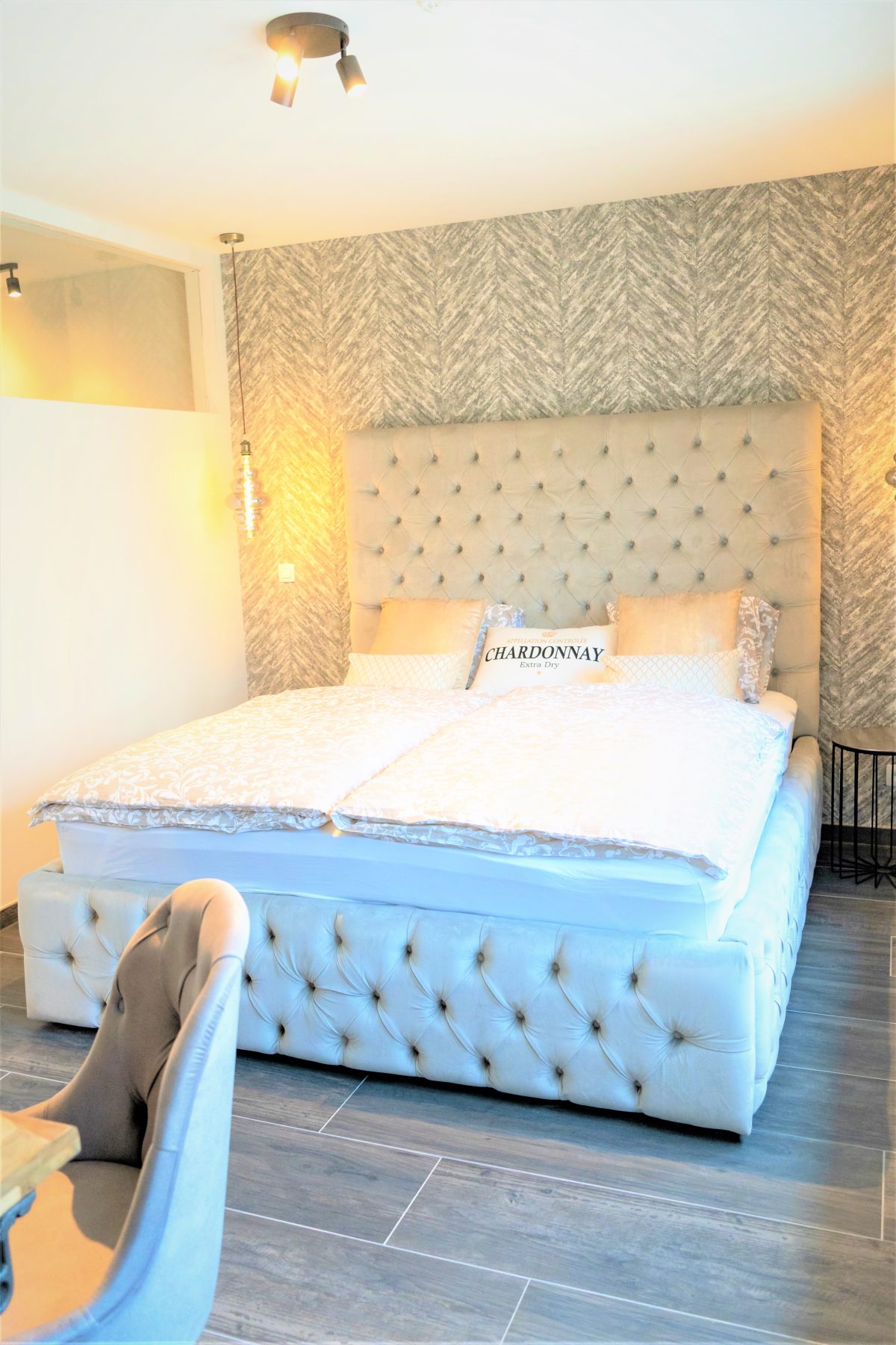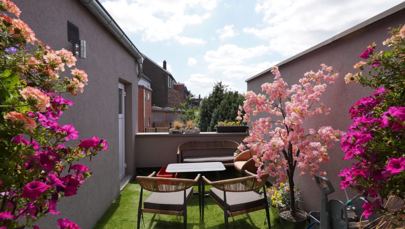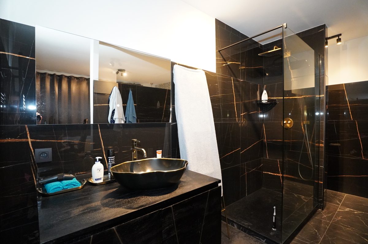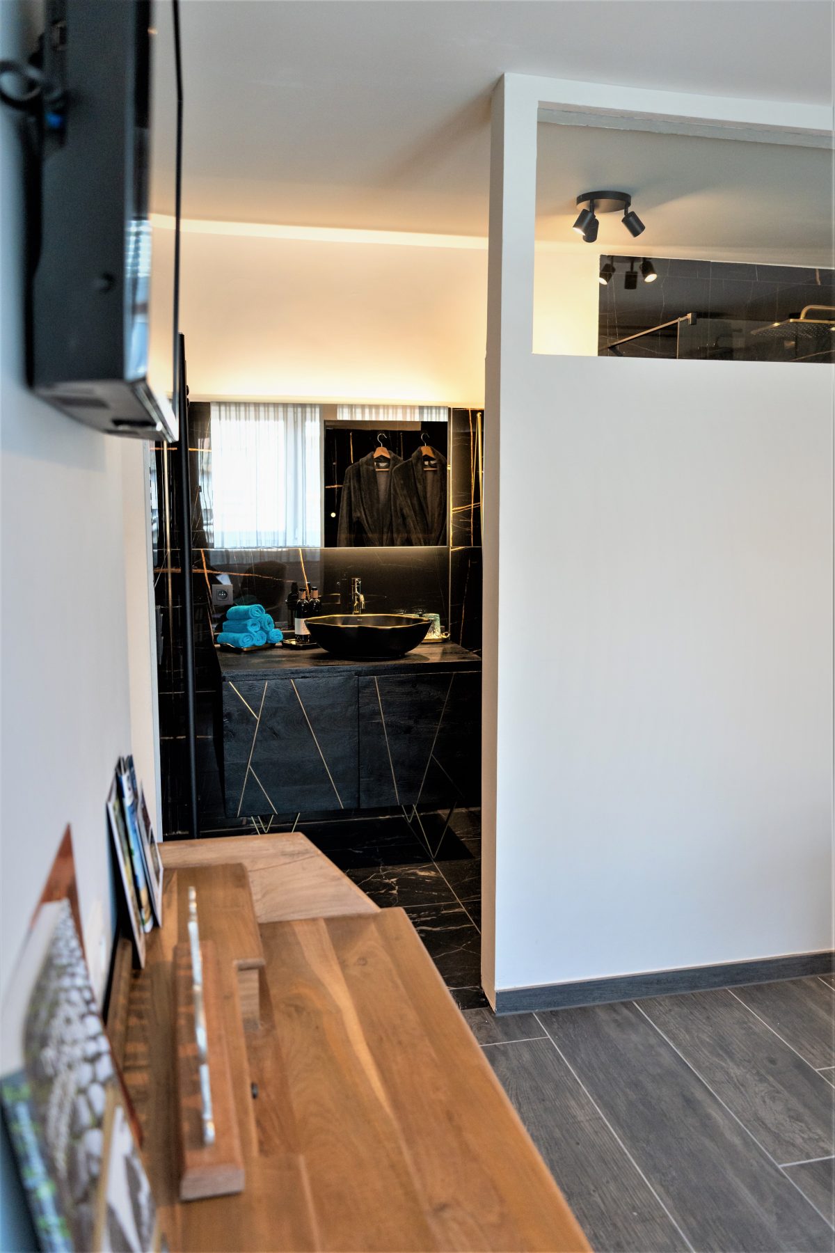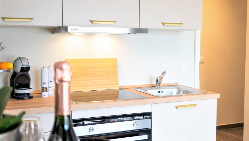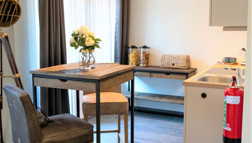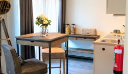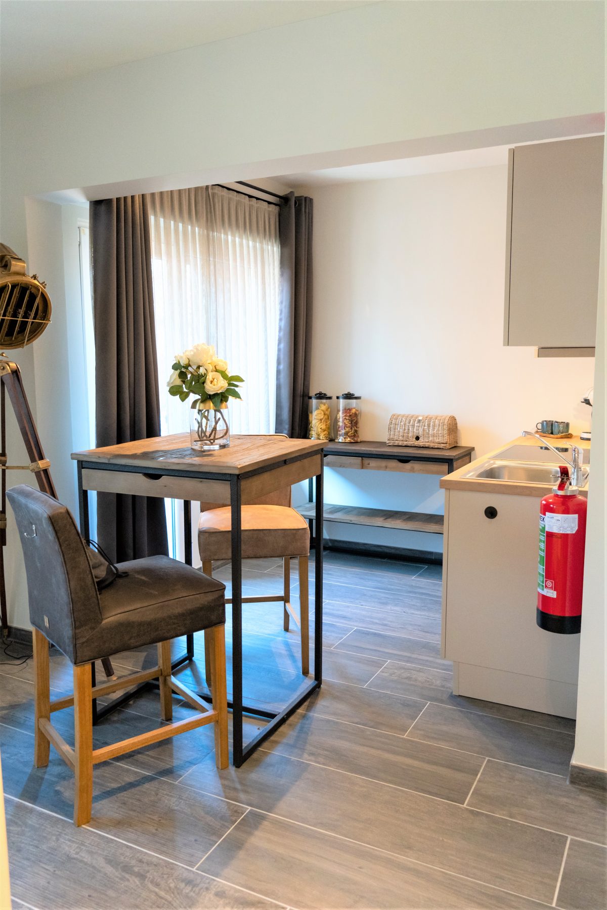 Die erste Etage besteht aus wunderschön renovierten und eingerichteten Apartments/Studios: Zwei modern eingerichtete Studios mit je 35 m², bestehend aus Wohnbereich mit Einbauküche, separatem Schlafzimmer, luxuriösem Bad mit begehbarer Dusche, Waschtisch und WC – jeweils mit eigenem Balkon. Zugang über gemeinsames Treppenhaus mit Flur und Abstellraum.