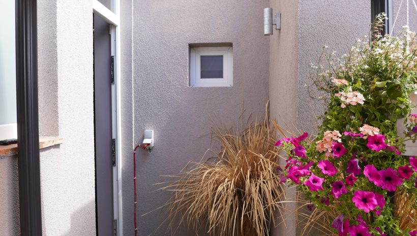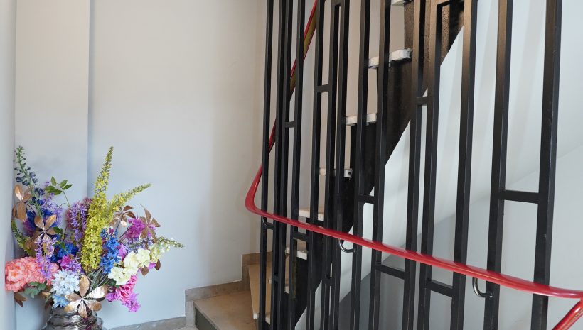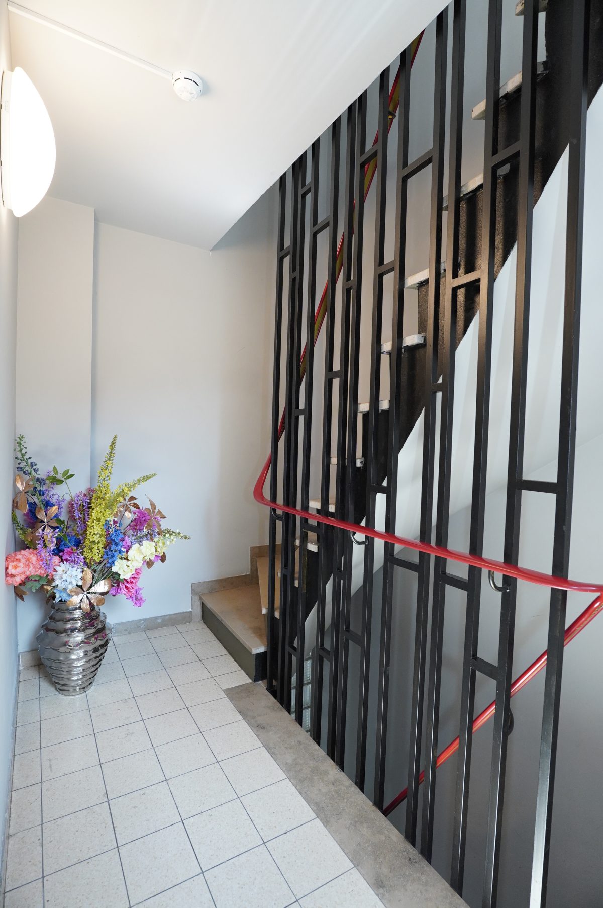 Auf der linken Seite der Fassade befindet sich der gemeinsame Eingangsbereich, der den Zugang zum Treppenhaus ermöglicht, das zu den Wohnungen, dem Untergeschoss und den Geschäftsräumen im Erdgeschoss führt.