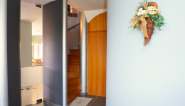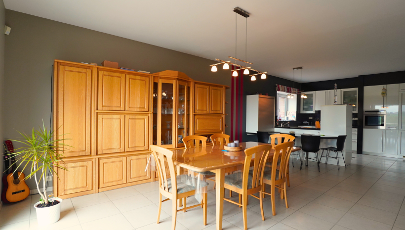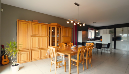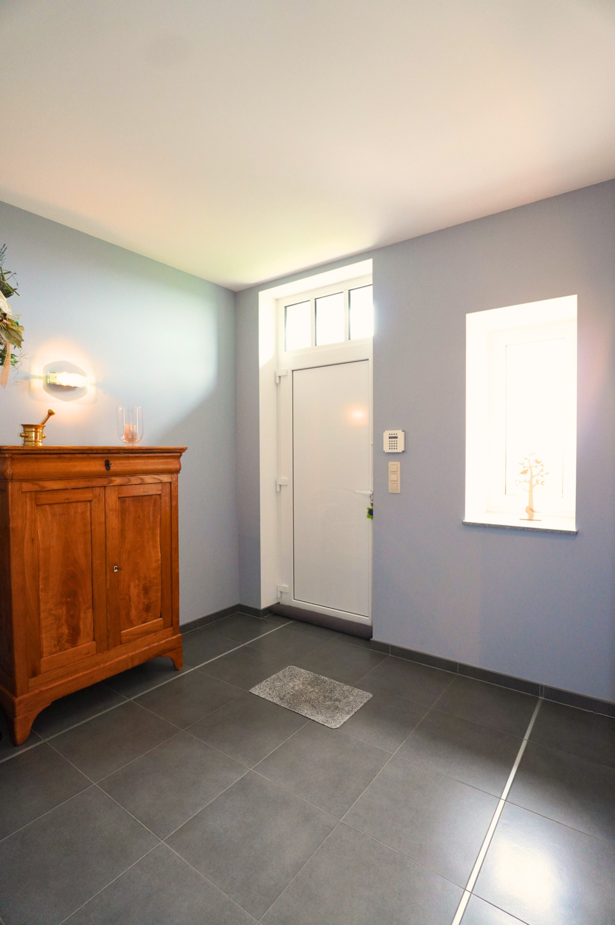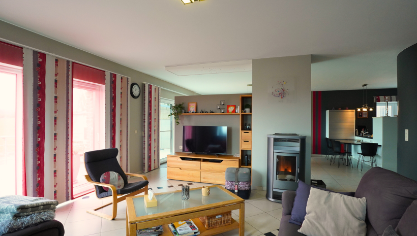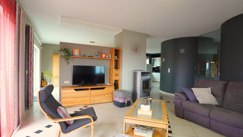 Einladende Eingangshalle, Garderobenbereich, separates WC, schöne Glastür, die in das geräumige Wohnzimmer führt, ausgestattet mit einem Pelletofen und einer Luft/Luft-Wärmepumpe. Das Esszimmer sowie die hervorragend ausgestattete Küche vervollständigen diesen schönen, halb offenen Wohnbereich. Große Schiebetüren sorgen für viel Licht und ermöglichen den Zugang zur großen, nach Süden ausgerichteten Terrasse mit herrlichem Blick über das Tal.