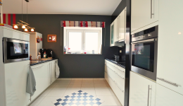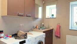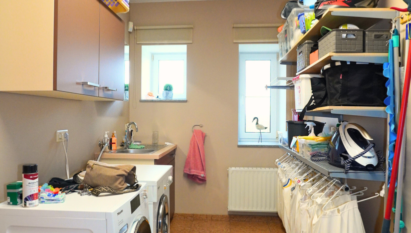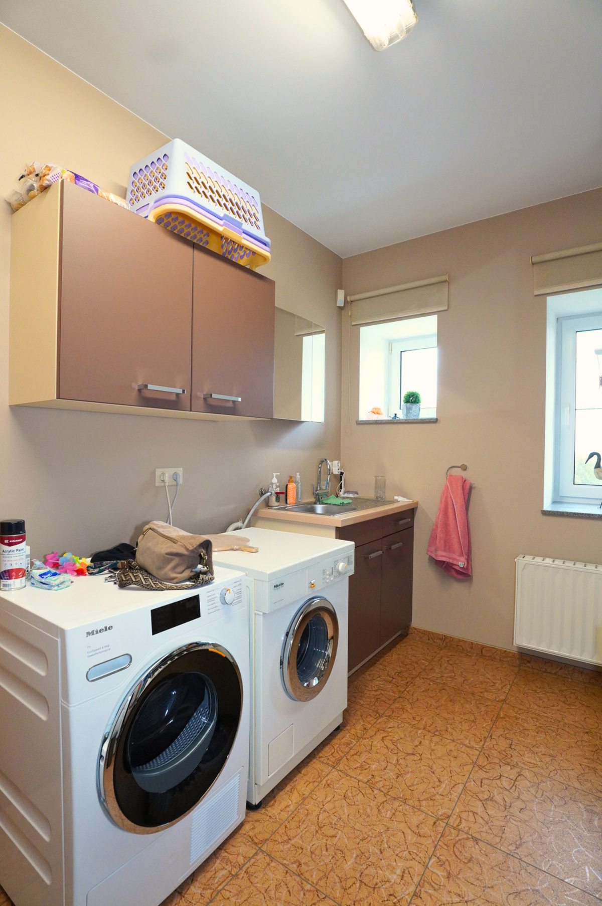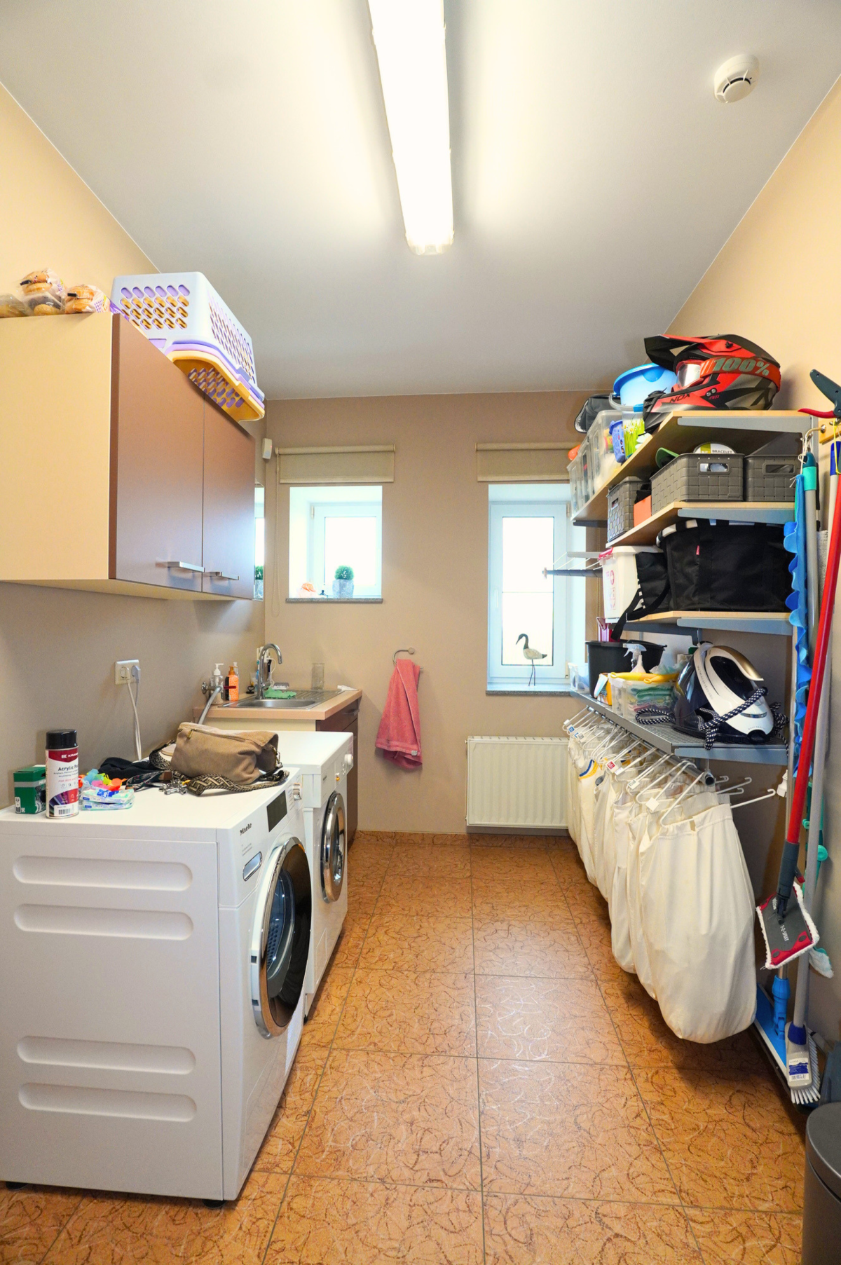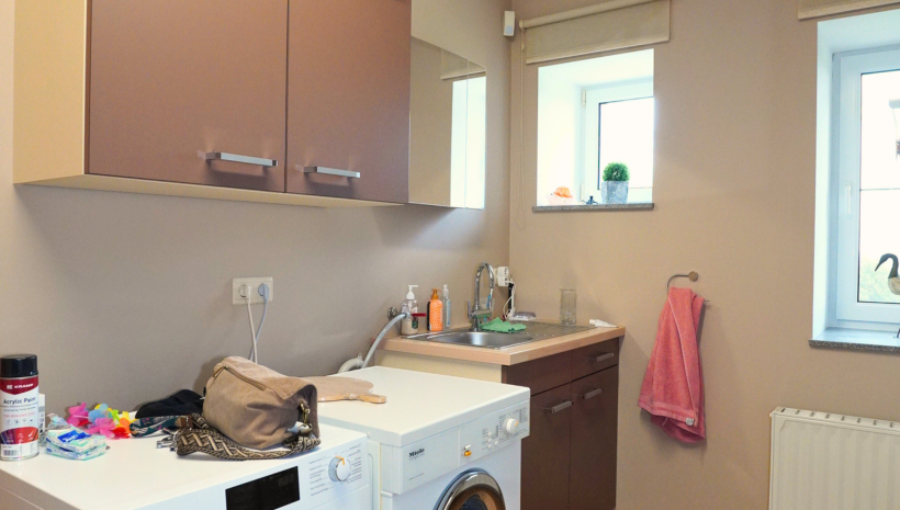 Die Waschküche ist mit Anschlüssen für eine Waschmaschine, maßgefertigten Möbeln mit integriertem Spülbecken sowie einer Dusche ausgestattet. Sie bietet direkten Zugang zur Küche, zum Eingangsbereich sowie zur Doppelgarage mit elektrischen Toröffnern. Direkt an die Garage schließt sich eine angrenzende Werkstatt bzw. ein Abstellraum an.