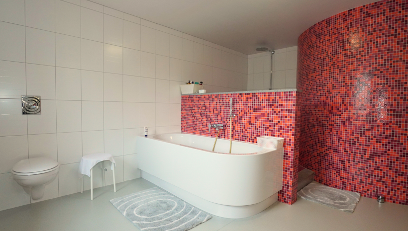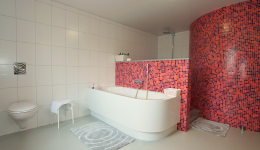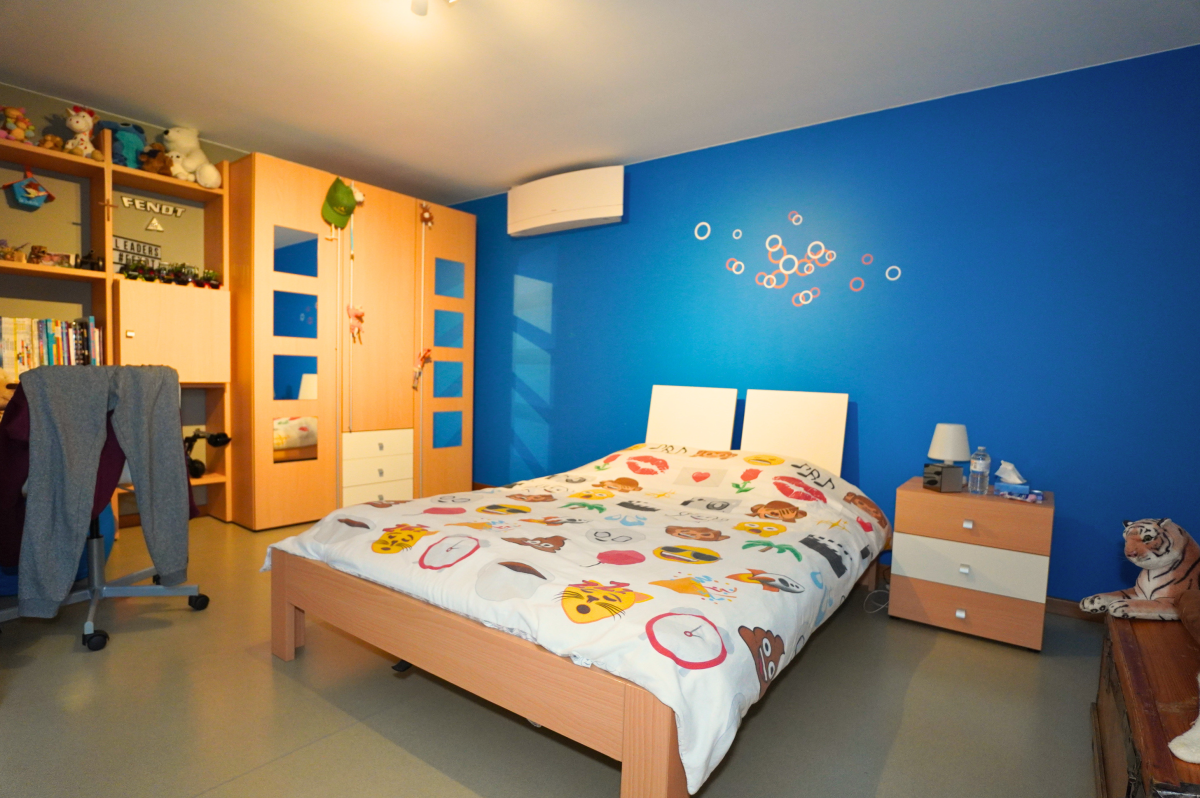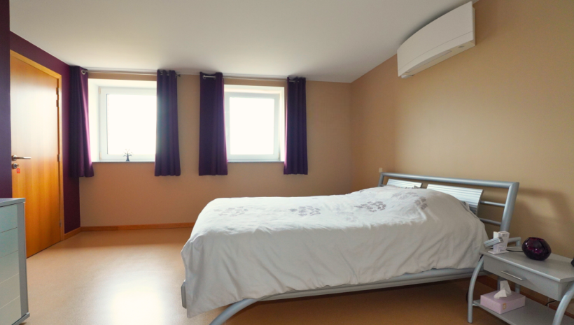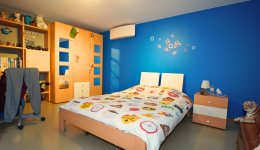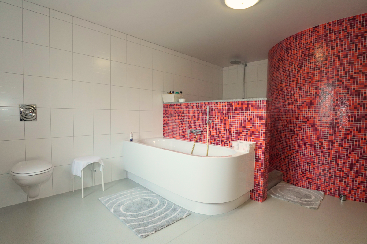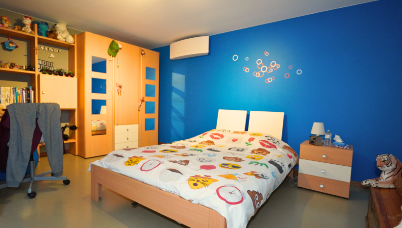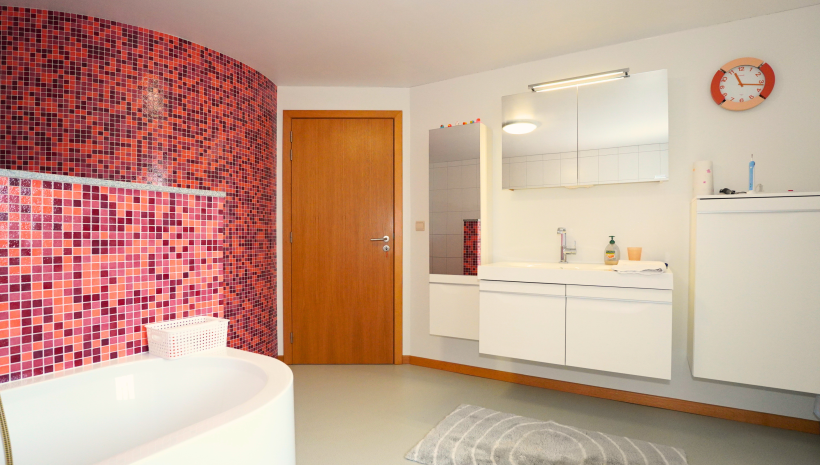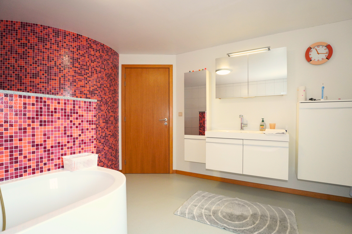 Ein Elternschlafzimmer mit angrenzendem Ankleidebereich, drei weitere Schlafzimmer, ein geräumiges Büro sowie ein Abstellraum für Wäsche, der ebenfalls als Büro genutzt werden kann. Das große Badezimmer ist ausgestattet mit einer großen, halboffenen Dusche, einer Badewanne, einem Waschtisch und einem WC.