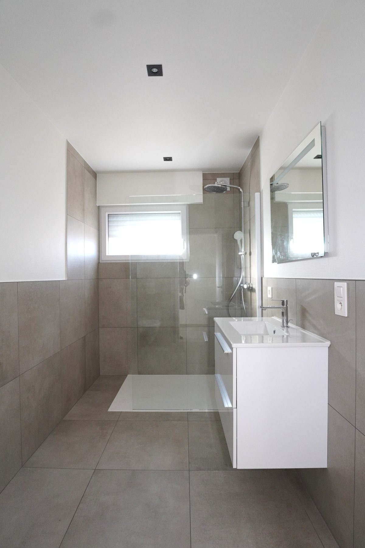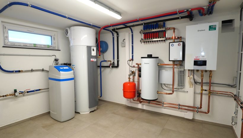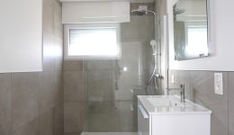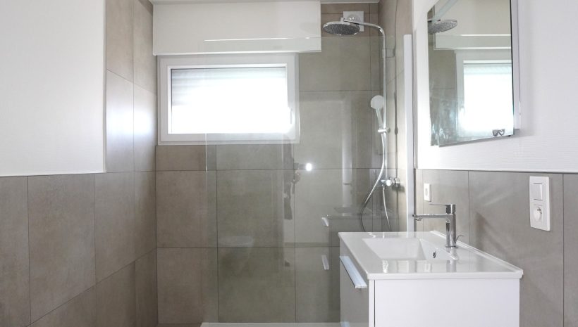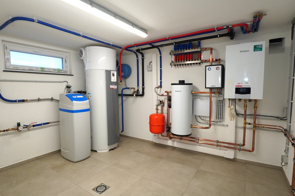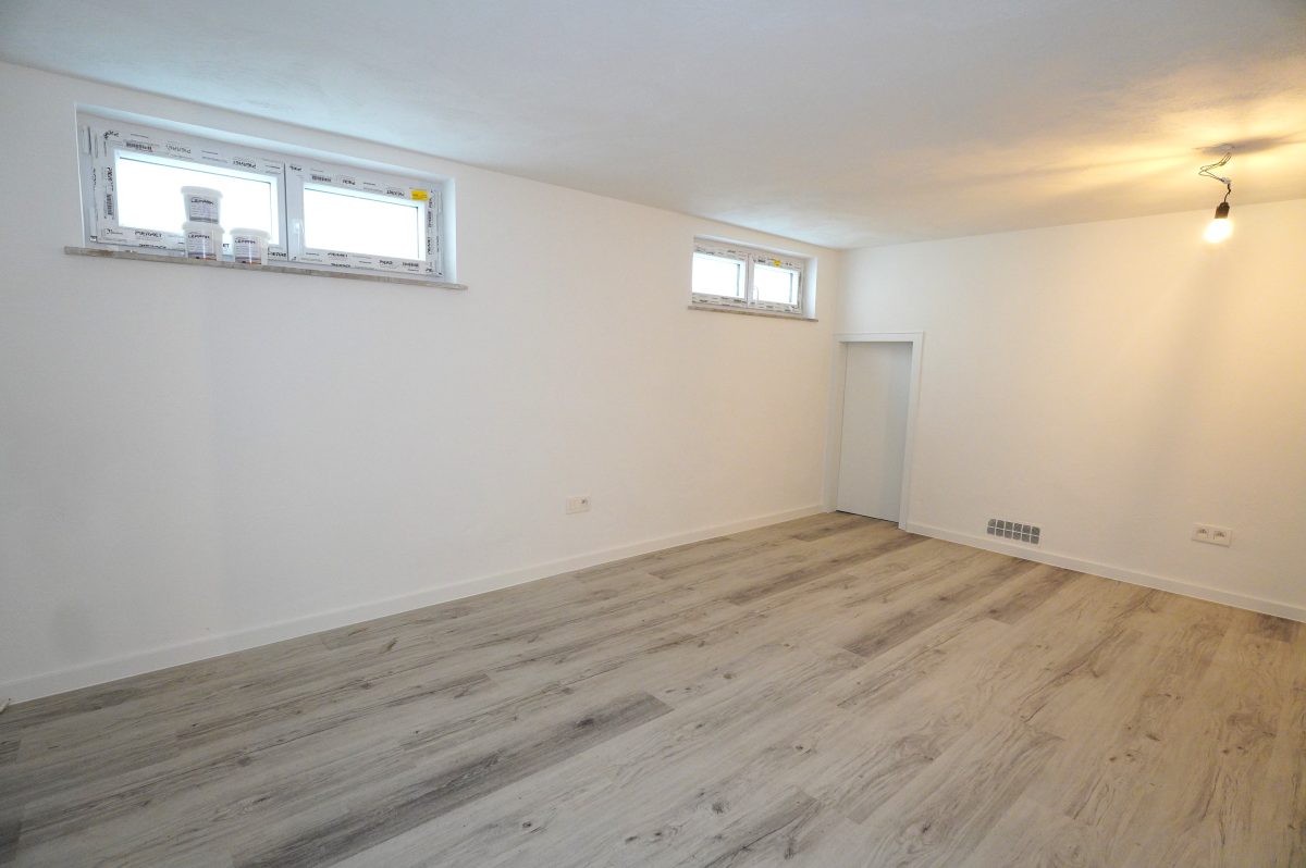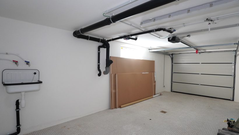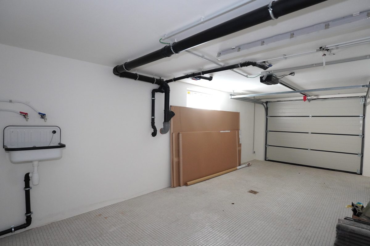 Das Untergeschoss umfasst ein großes Büro/Hobbyraum oder einen anderweitig nutzbaren Raum mit viel Tageslichteinfall, ein zweites Duschbad mit Dusche, Waschbecken, WC und Anschlüssen für eine Waschmaschine, einen Technikraum mit neuer Wärmepumpe, thermodynamischem Boiler für Warmwasser und Entkalker, eine große Garage mit elektrischem Garagentor sowie einen Abstellraum mit den Zählern und Wechselrichtern.