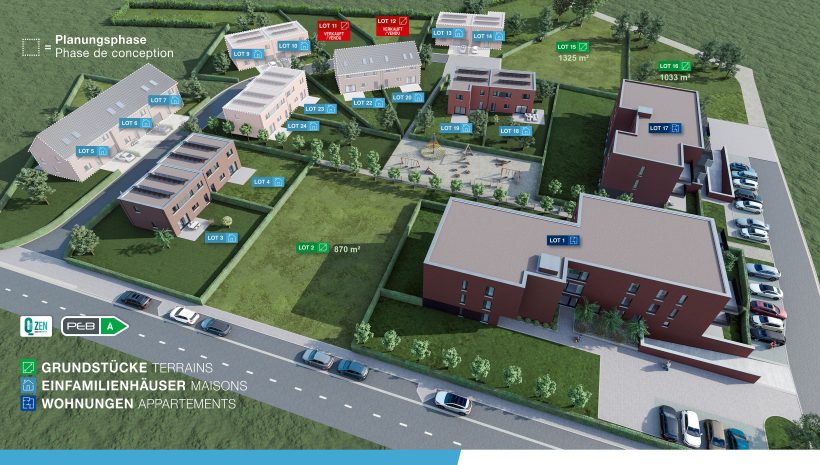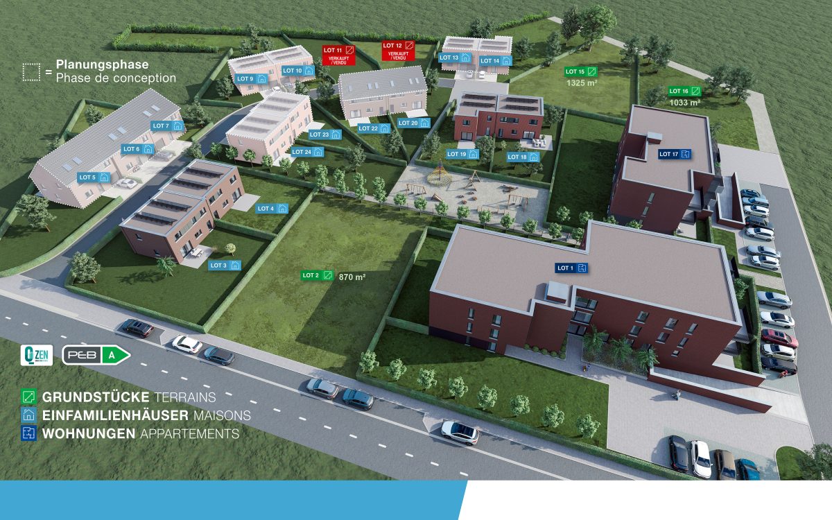 Gemmenich – Völkerich, 31 (Los 1): Im ruhigen Weiler Völkerich, ideal gelegen zwischen Gemmenich und Bleyberg und in unmittelbarer Nähe zu Aachen, Vaals und Maastricht, bieten wir Ihnen ein familienfreundliches Wohnumfeld mit herrlichem Ausblick.