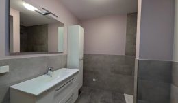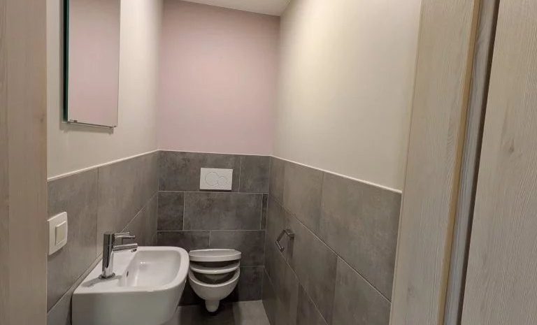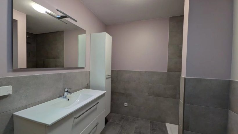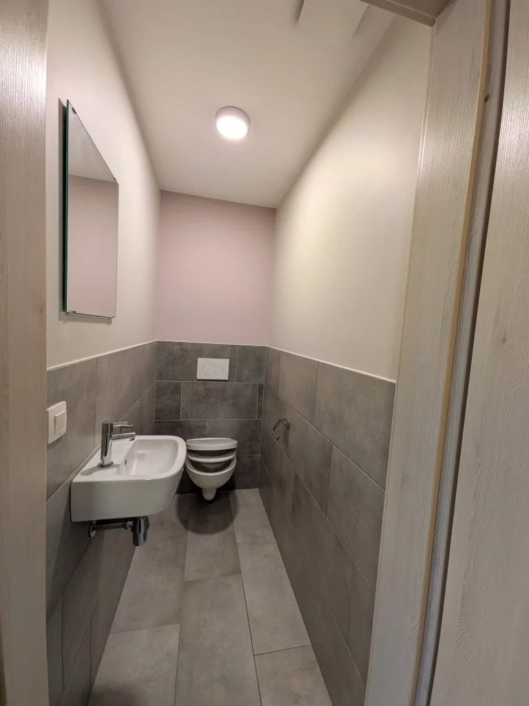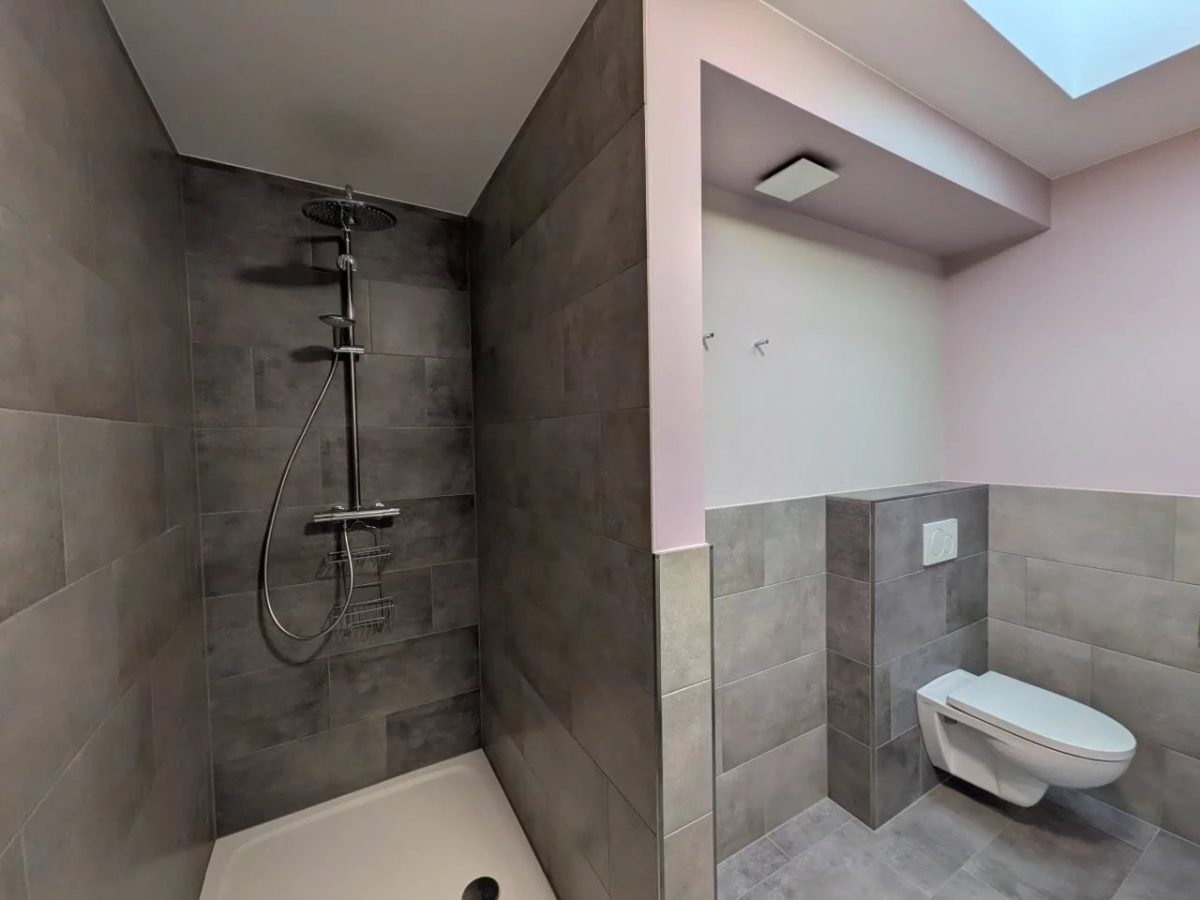 Das geschmackvoll geflieste Bad verfügt über eine großzügige italienische Dusche, WC sowie ein Waschbecken mit modernem Unterschrank. Ein Oberlicht sorgt für natürliches Tageslicht und zusätzliche Helligkeit.