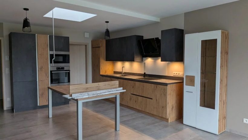 Das Herzstück der Wohnung bildet der großzügige Wohn- und Essbereich mit offenem Küchenkonzept auf ca. 32 m². Die moderne, hochwertige Einbauküche in stilvoller Holzoptik mit schwarzen Akzenten fügt sich harmonisch in den Raum ein. Große Fenster sowie ein zusätzliches Oberlicht im Küchenbereich sorgen für ein besonders angenehmes Raumgefühl.